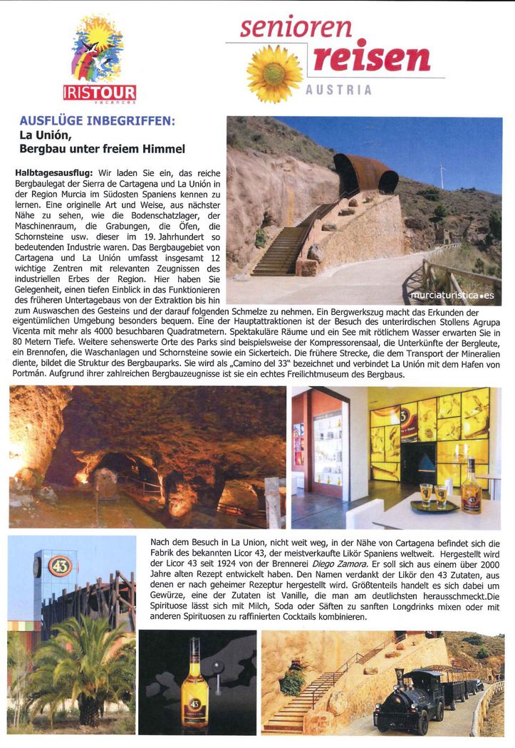 Las visitas a La Unión tendrán como eje el Parque Minero e incluirán una actuación flamenca en el interior de la Mina Agrupa Vicenta. Además de un recorrido por la localidad, la excursión también les llevará a conocer las nuevas instalaciones de Licor 43, sitas junto a Roche.
