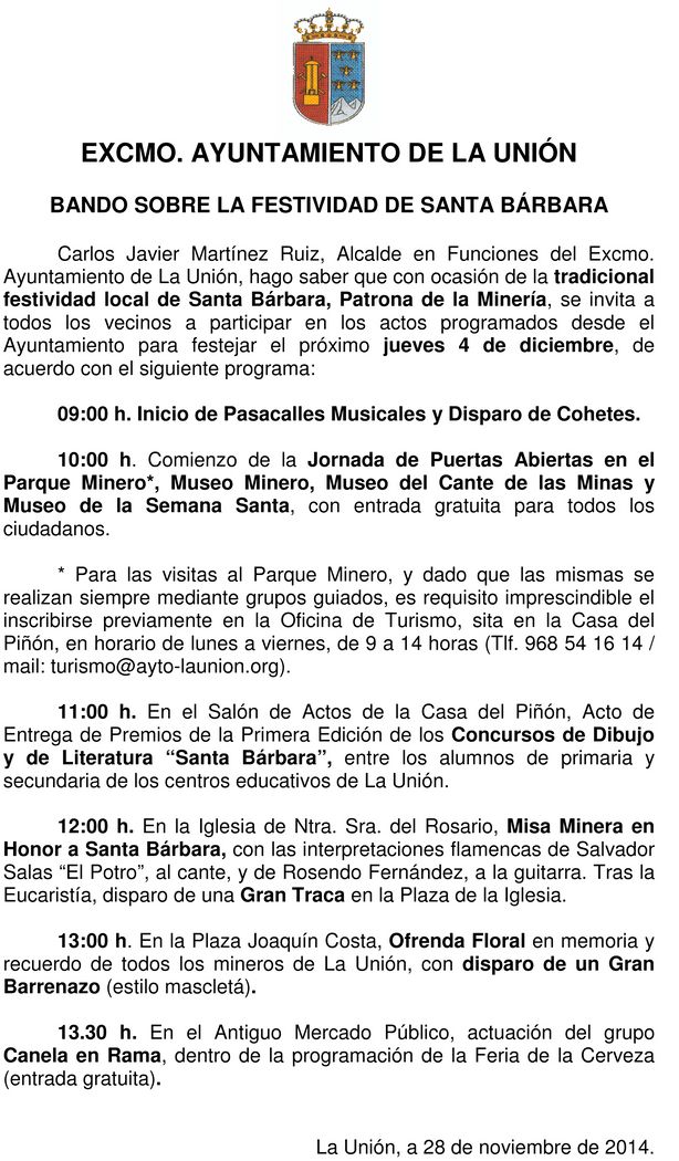 12.00 h: En la Iglesia de Ntra. Sra. del Rosario, Misa Minera en Honor a Santa Bárbara, con las interpretaciones flamencas de Salvador Salas “El Potro”, al cante, y de Rosendo Fernández, a la guitarra. Tras la Eucaristía, disparo de una Gran Traca en la Plaza de la Iglesia.