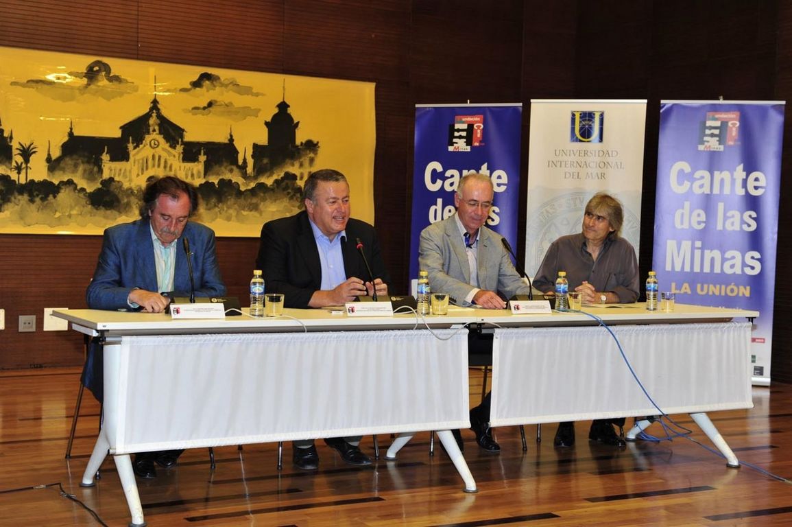 El Secretario general de la Consejería de Universidades, Empresa e Investigación de la Región de Murcia, Antonio Navarro, el Vicerrector de Desarrollo Estratégico de la Universidad de Murcia, Fernando Martín, el Alcalde de La Unión y Presidente Ejecutivo de la Fundación Cante de las Minas, Francisco Bernabé, y el cantaor , así como Lámpara Minera y director de la Cátedra de Flamencología de la Universidad de Córdoba, Luis Pérez Cardoso “Luis de Córdoba” han clausurado el IV Congreso Internacional Universitario de Investigación sobre el Flamenco, celebrado desde el pasado jueves y hasta hoy, en la Casa del Piñón, sede del Excelentísimo Ayuntamiento de La Unión.