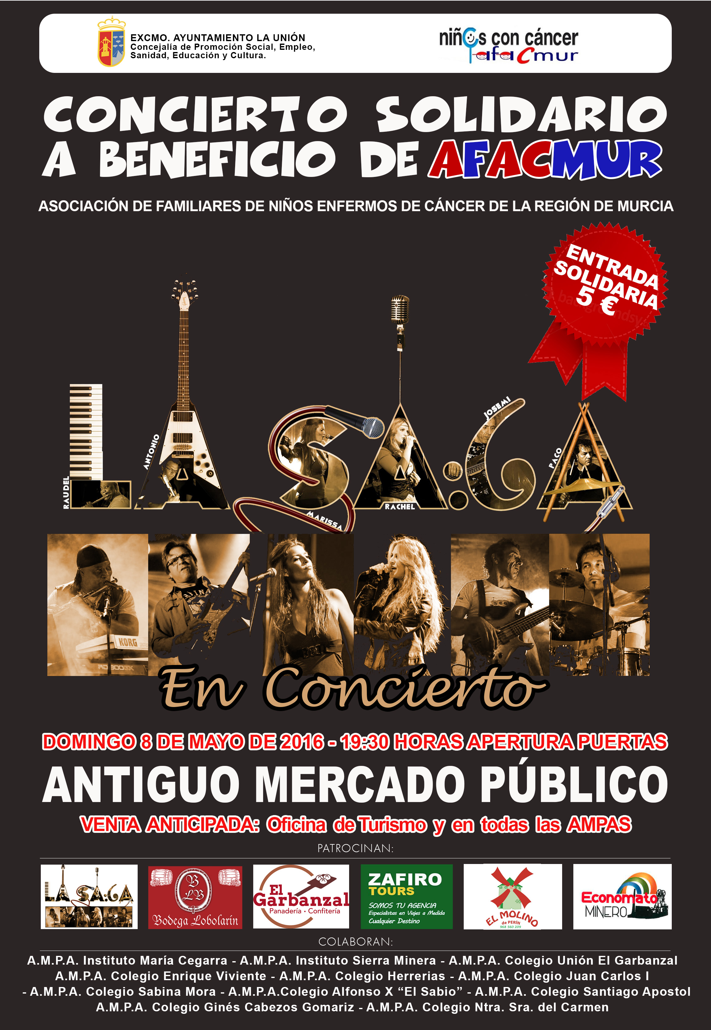 La entrada solidaria tiene un precio de 5 Euros y se pueden comprar en la Oficina de Turismo del Ayuntamiento de La Unión y a través de las AMPAS de todos los Colegios del Municipio.