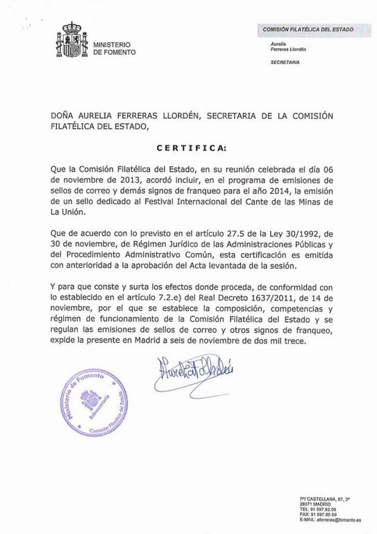 La Comisión Filatélica del Estado ha acordado, en su reunión celebrada el pasado 6 de noviembre de 2013, la emisión de un sello de correos dedicado al Festival Internacional del Cante de las Minas, que va a quedar incluido en la programación de emisiones de sellos y demás signos de franqueo para el año 2014.