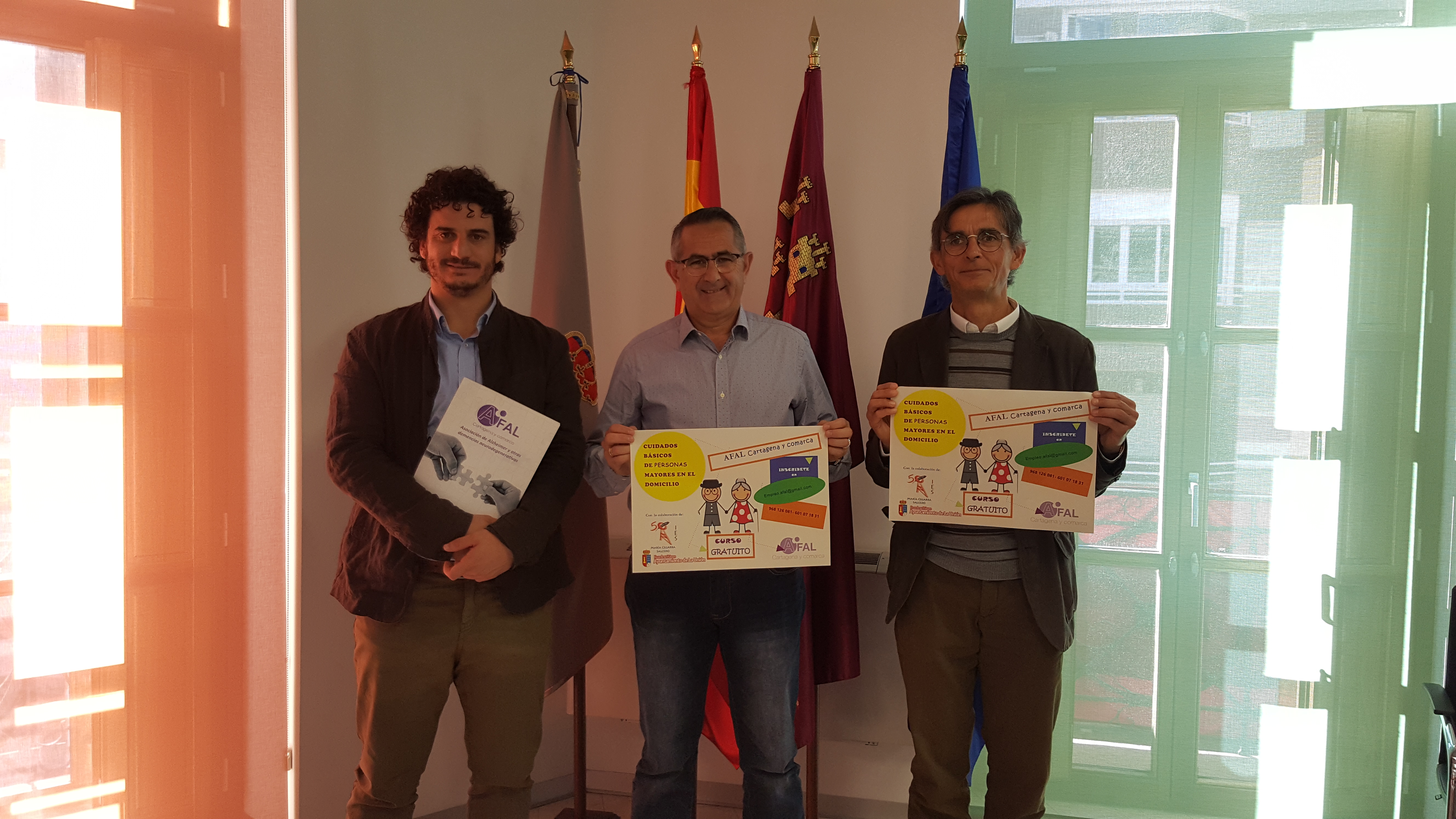 Esta mañana el Alcalde de La Unión, Pedro López Milán, el Gerente de AFAL de Cartagena y Comarca, Raúl Nieto Galera y el Director del IES María Cegarra, José Luis Pérez han presentado el curso denominado “Cuidados básicos de personas mayores en el domicilio” que se impartirá durante los días 20 de Abril a 16 de Mayo.
