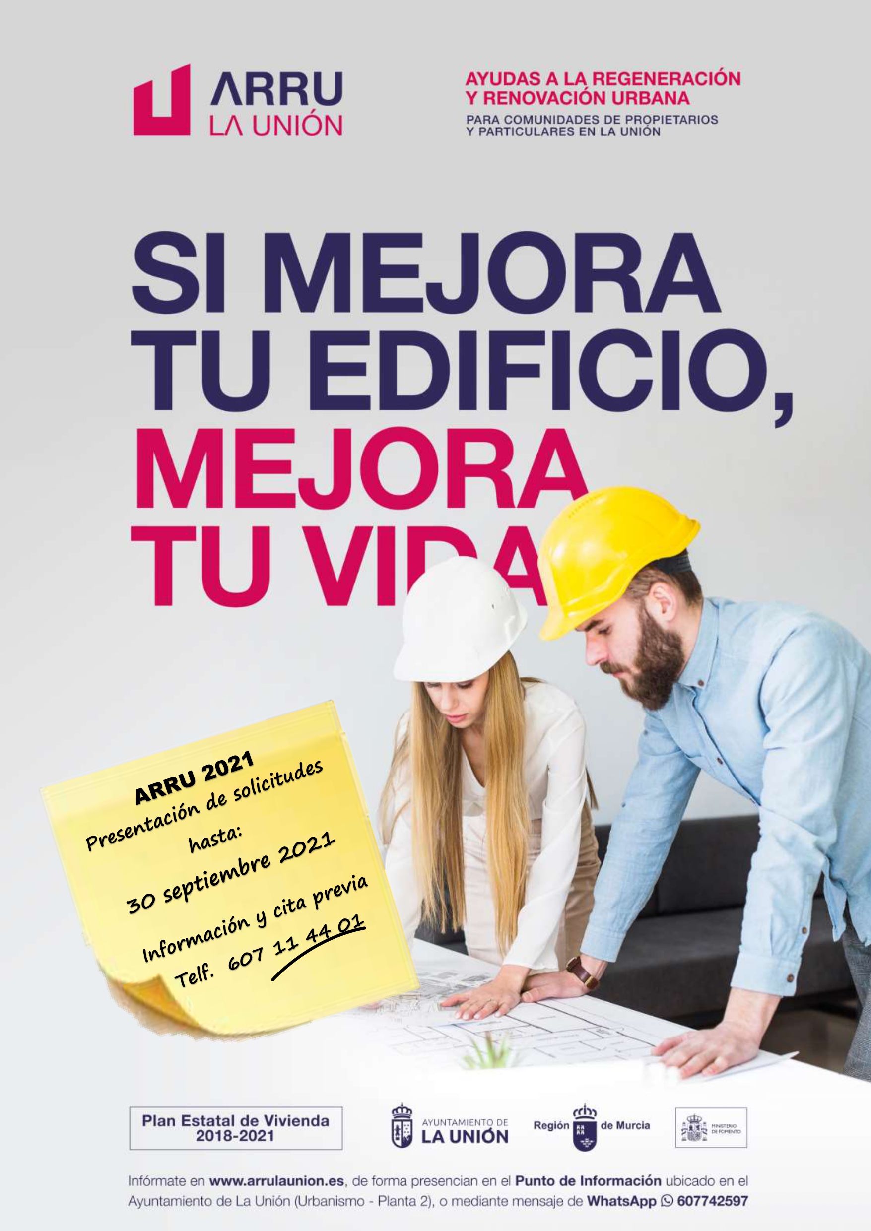 Más información en www.arrulaunion.es , mensaje de whatsapp al 607 742 597 o en el punto de información del ARRU en Ayuntamiento de La Unión (Urbanismo 2ª planta).