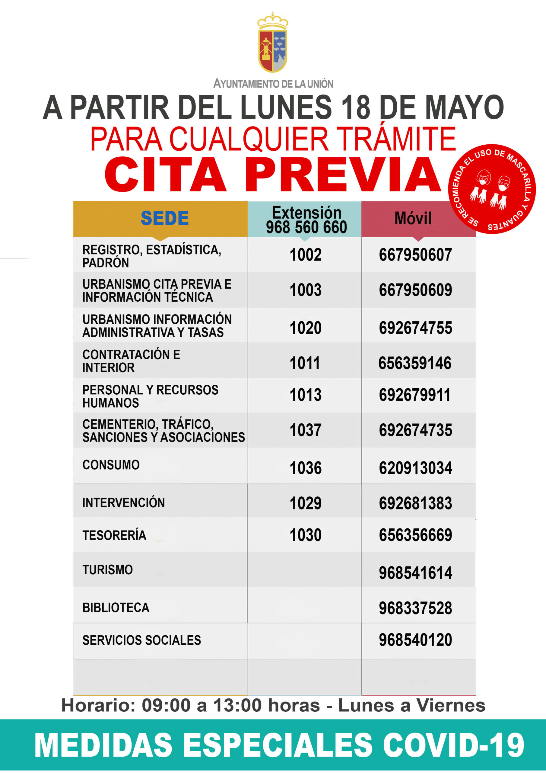 El Ayuntamiento de La Unión, pone a disposición de los ciudadanos los números de teléfono de los diferentes Departamentos para realizar sus trámites de manera presencial, a partir del 18 de Mayo.