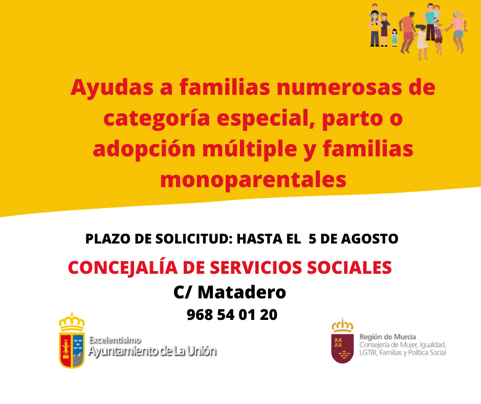 El Ayuntamiento de La Unión ha comenzado a tramitar las ayudas a Familias Numerosas de categoría especial, Parto Múltiple o Adopción Múltiple y a Familias Monoparentales. 2022. El plazo de presentación de solicitudes será, del 18 de Julio hasta el 5 de Agosto de 2022.