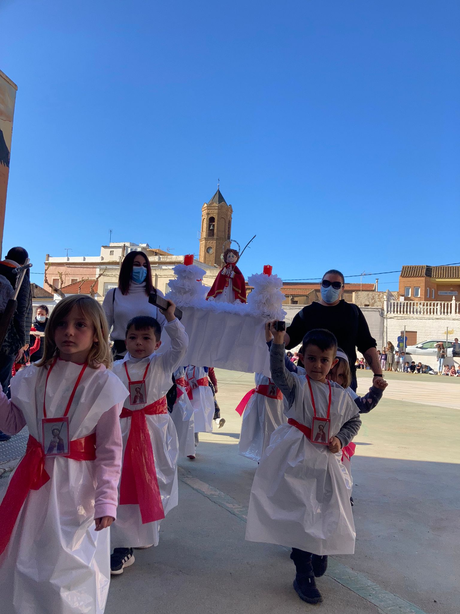 Las diferentes agrupaciones han lucido túnicas confeccionadas de forma doméstica con los tradicionales colores de las agrupaciones, que han desfilado al ritmo de una banda de tambores que marcaba el paso de los tronos. Los numerosos alumnos del centro han ejercido de público con palmas y vítores al paso de las imágenes y han aplaudido la interpretación de un cántico a la Virgen por parte de la alumna de Sexto de Primaria, Lucía del Mar Torrecilla García.