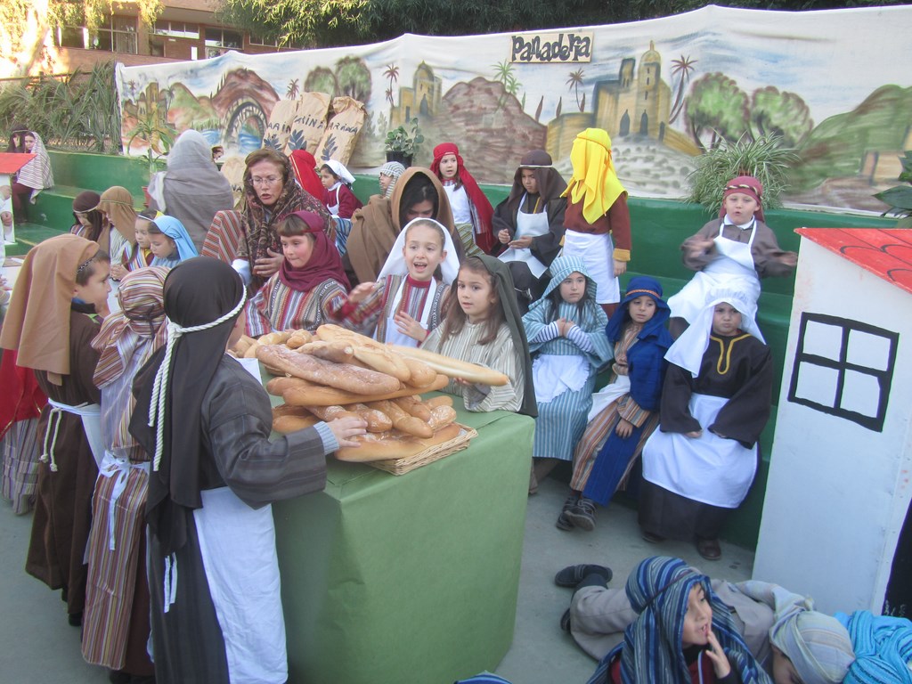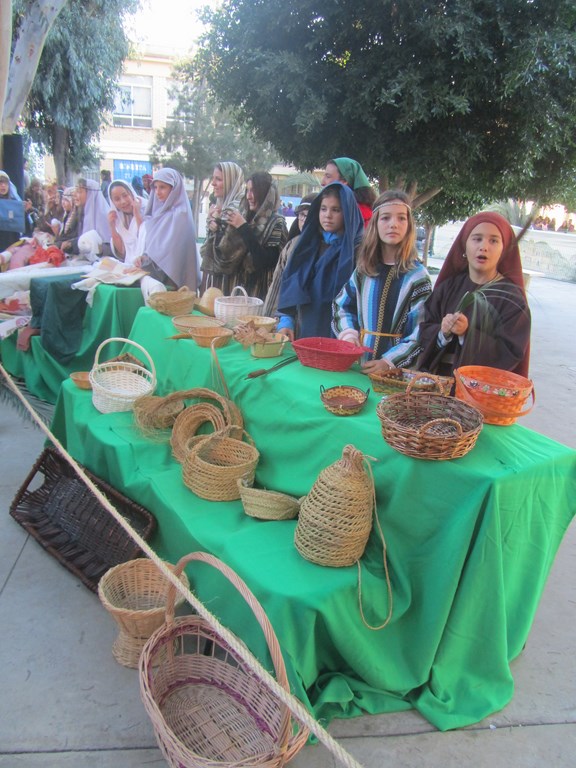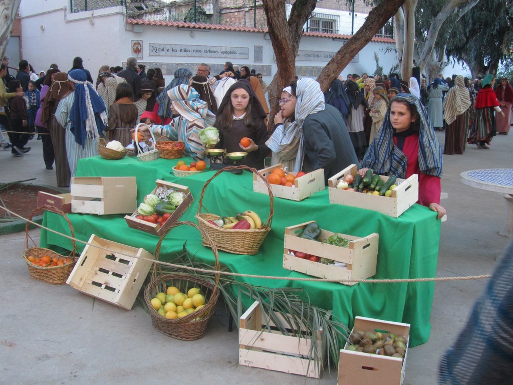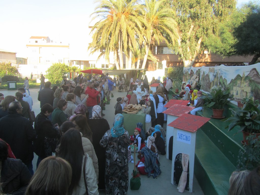 Fueron más de ochocientos alumnos, profesores y personal del Centro los que consiguieron trasladar el pueblo de Belén al colegio, así se representa el mercado de frutas, telas y demás junto a alfareros, panaderos, soldados, castañeras, lavanderas, pastores, etc. Las imágenes ofrecen a los pobladores de Belén en plena faena incluyendo el portal con un niño Jesús.