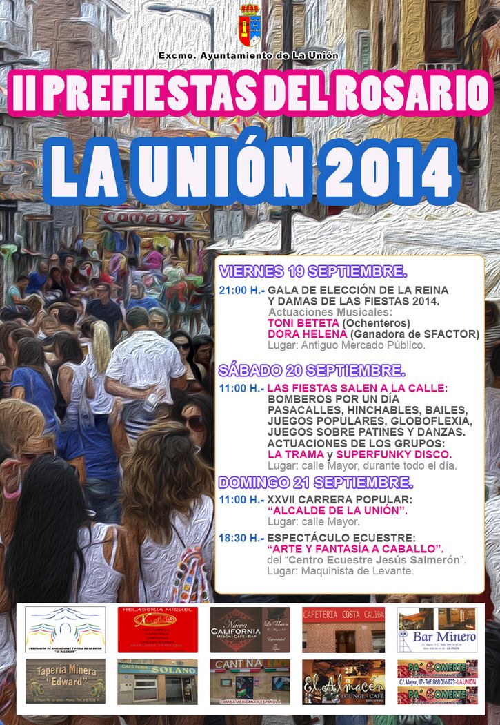 Por otro lado, un día después, el sábado 20, desde las 11:00 horas de la mañana, la Concejalía de Festejos que dirige María Hermógenes, la Federación de Peñas Festeras “El Palenque” de La Unión y los locales hosteleros de la calle Mayor y zonas adyacentes, han organizado las “II Prefiestas de la Virgen del Rosario”, una jornada festiva que se va a desarrollar por segundo año consecutivo a lo largo de todo el día en la calle Mayor.