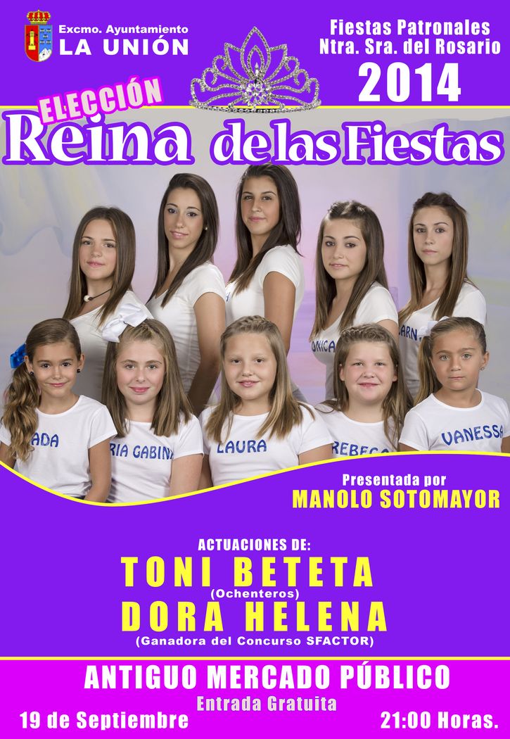 Este viernes día 19 de septiembre, a las 21:00 horas, en el Antiguo Mercado Público de La Unión se va a celebrar la Gala de Elección de la Reina y Damas Juveniles de las Fiestas del Rosario 2014.