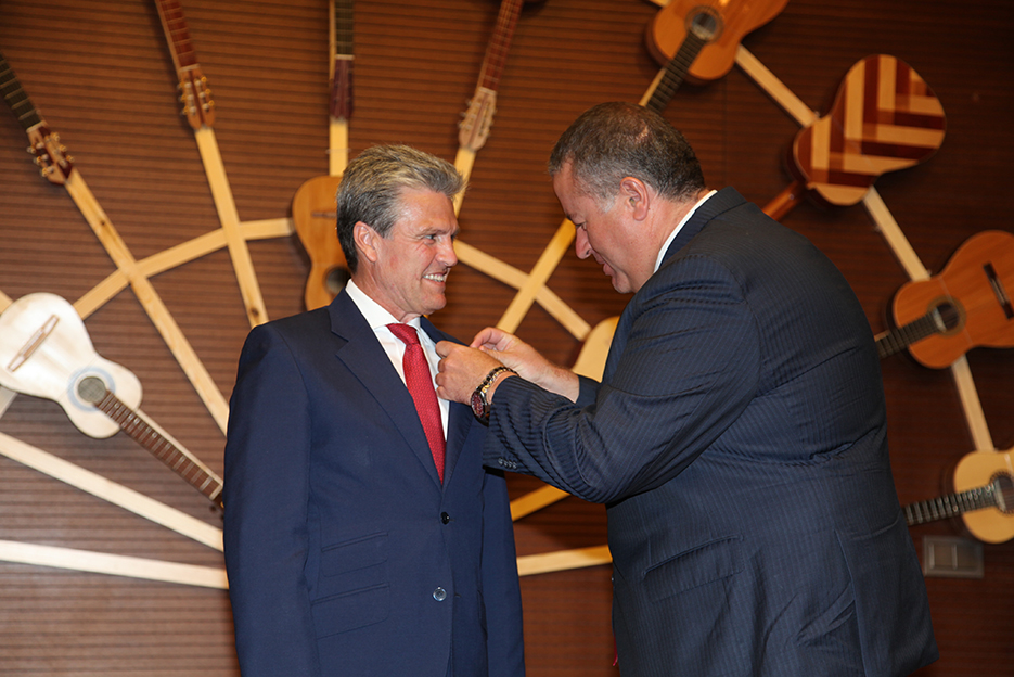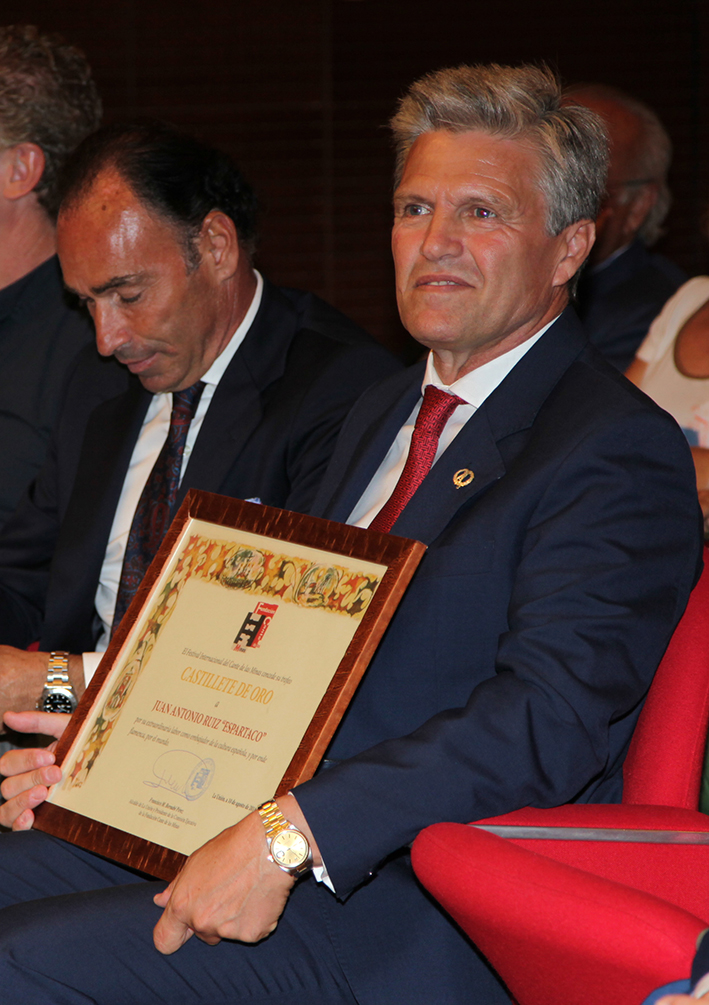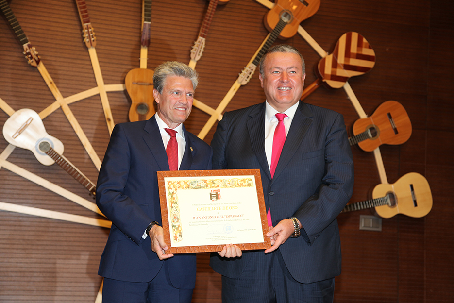 La Unión, 10 de agosto de 2014.- El que fuera durante años “amo indiscutible de las plazas de toros”, Juan Antonio Ruiz “Espartaco”, ya luce en la solapa su “Castillete de Oro” del Festival Internacional del Cante de las Minas, que reconoce su dilatada y exitosa carrera como matador, así como su labor de difusión de la cultura española, del toreo y del flamenco, siempre entrelazados, por todo el mundo. El encargado de entregarle este reconocimiento ha sido el Alcalde de La Unión y Presidente Ejecutivo de la Fundación Cante de las Minas, Francisco Bernabé, en presencia, además, de un buen amigo de Espartaco, el también torero Pepín Liria.