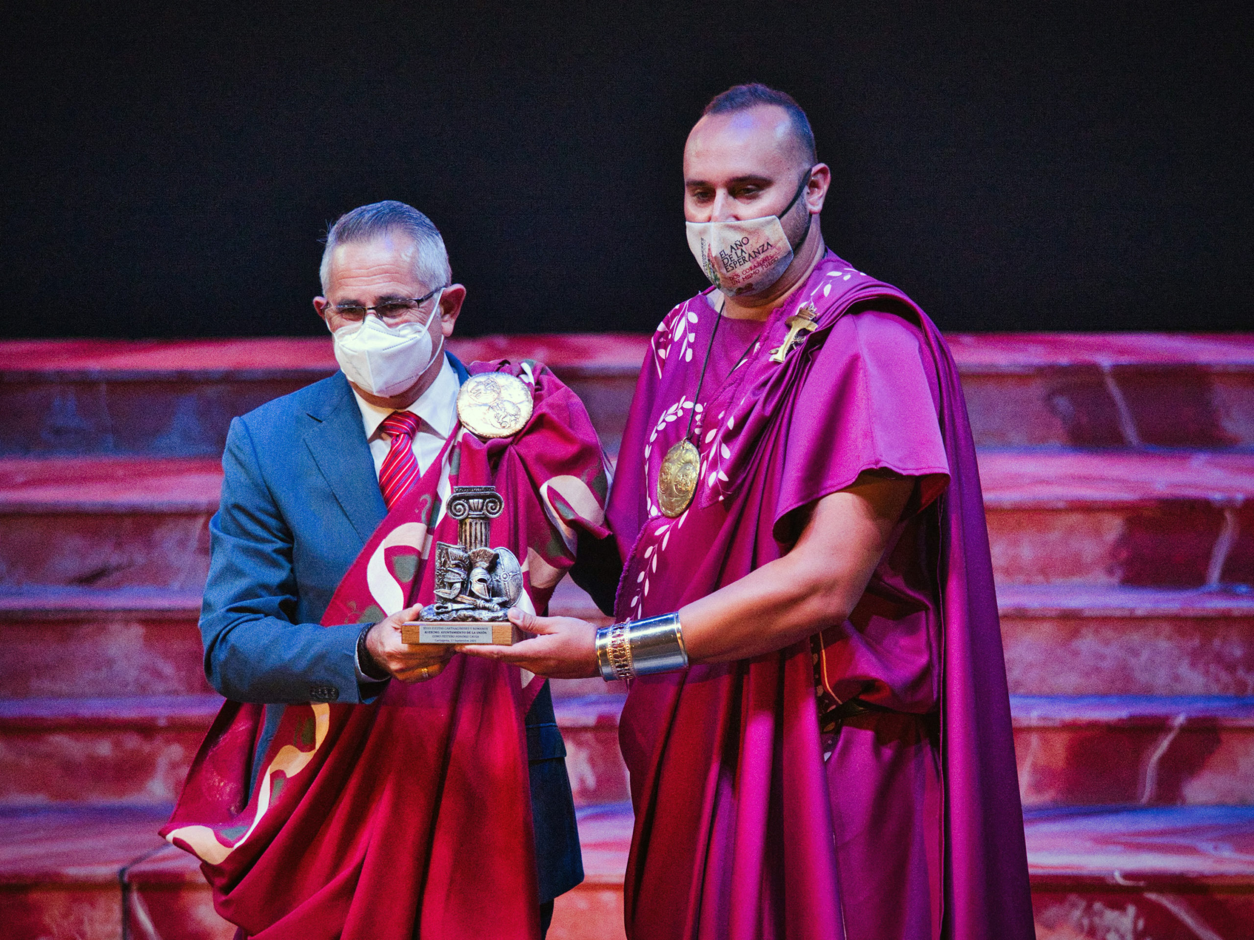 El vicepresidente de la Federación de Tropas y Legiones, Eduardo Conesa, ha sido el encargado de entregar el galardón e imponer la toga de festero al alcalde de la localidad, Pedro López Milán. La entrega de este premio ha estado precedida por la proyección de un audiovisual de La Unión donde se invita al espectador a disfrutar de La Unión a través de sus paisajes, su patrimonio, su gastronomía y del Festival Internacional del Cante de las Minas.