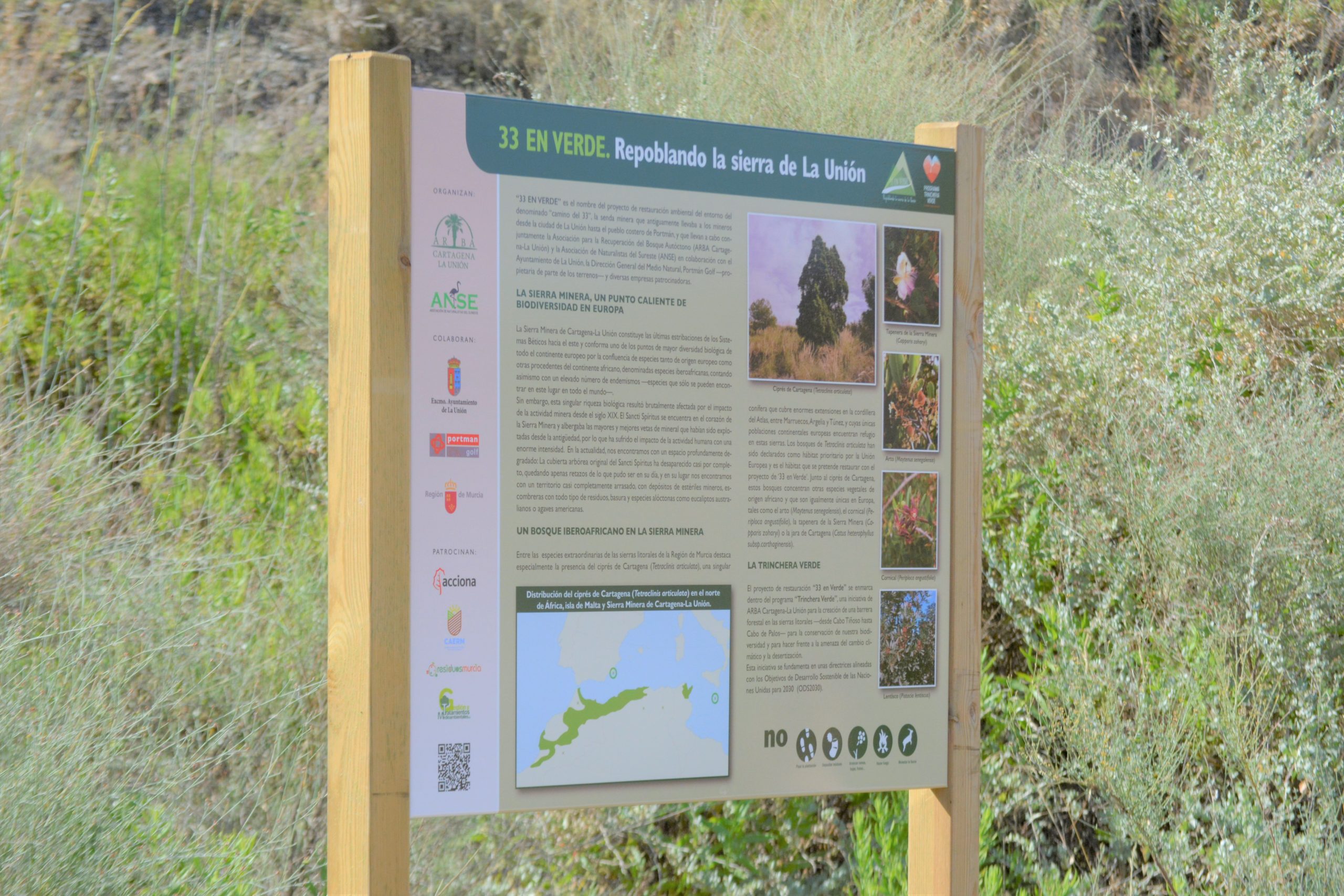 El Ayuntamiento de La Unión y la Asociación ARBA Cartagena- La Unión han instalado en la zona del 33 una serie de carteles indicativos que ubican al visitante dentro de la Sierra Minera y explican su origen, historia y actual recuperación medioambiental basada en el hábitat del ciprés de Cartagena, un tipo de bosque propio de las montañas del Atlas, entre Marruecos, Argelia y Túnez, que en Europa solo se encuentra en Cartagena y La Unión.