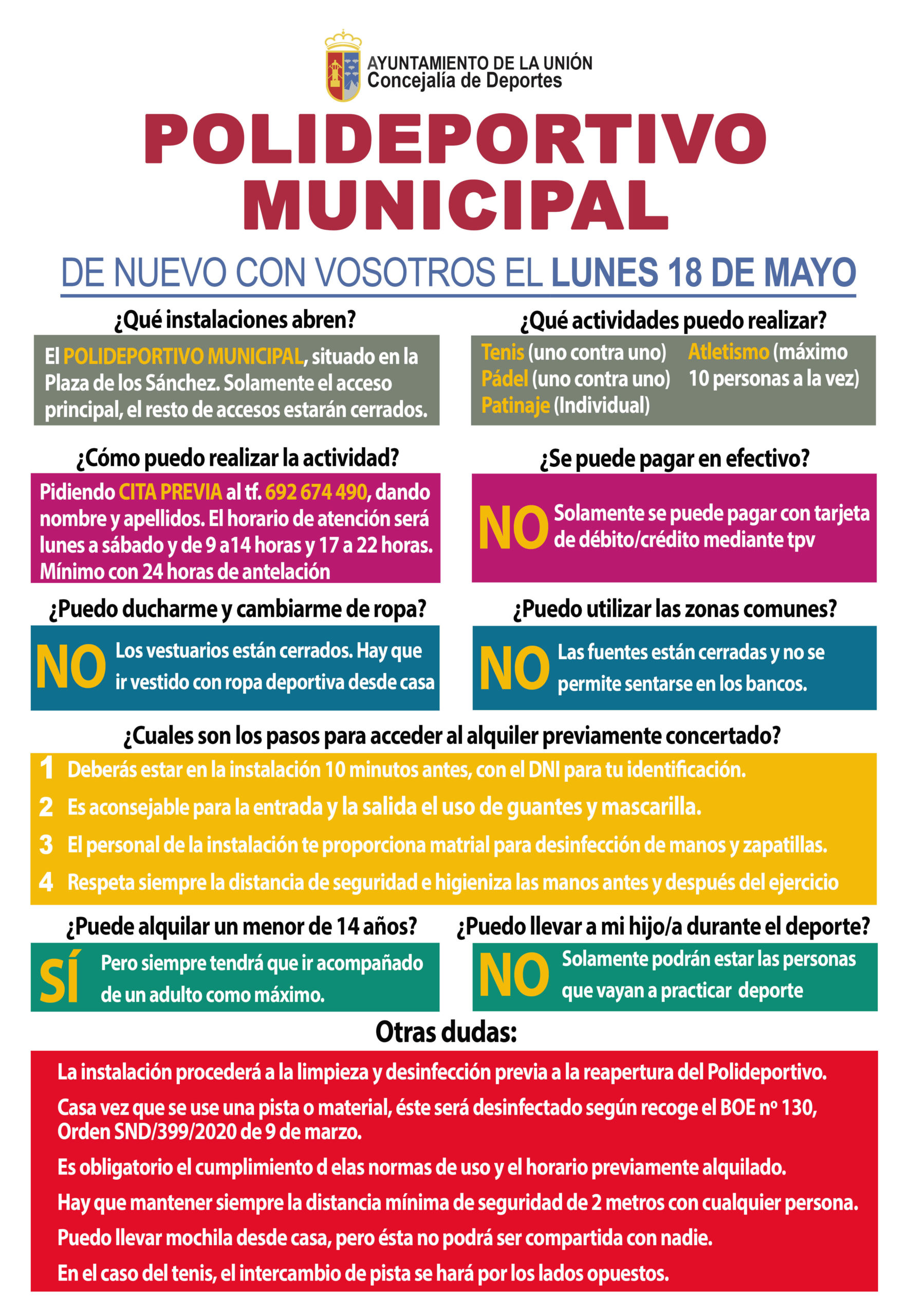 Para cualquier duda, se ha elaborado un cartel en el que se recogen todas las medidas que se deberán adoptar para hacer uso de las instalaciones del Polideportivo Municipal.