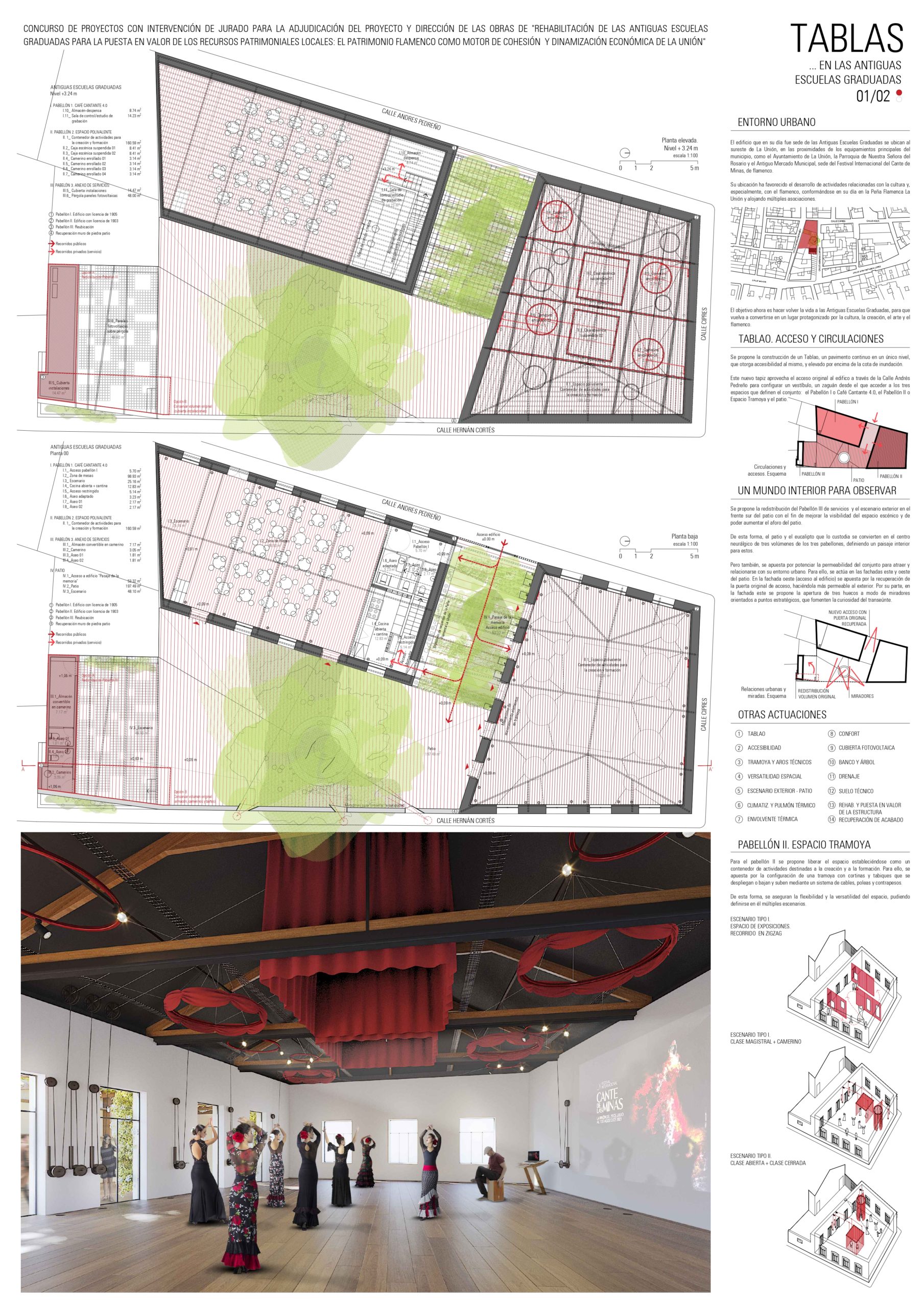 Los arquitectos Joan Santiago Blanco (Lo Coco Arquitectura) y María Martínez Morón (Atelier María Morón) han obtenido el primer premio en el concurso de proyectos PIREP Local para la rehabilitación de las Antiguas Escuelas Graduadas de La Unión. El primer premio, con una dotación de 4.840 euros, ha correspondido a su propuesta denominada “Las Tablas”. Se trata de una interpretación del edificio que redistribuye el espacio de las antiguas escuelas a partir de un zaguán, al que se accede por la calle Andrés Pedreño, y que actúa como vestíbulo de entrada a los tres grandes espacios del conjunto arquitectónico; café cantante, espacio tramoya y el gran patio del eucalipto.