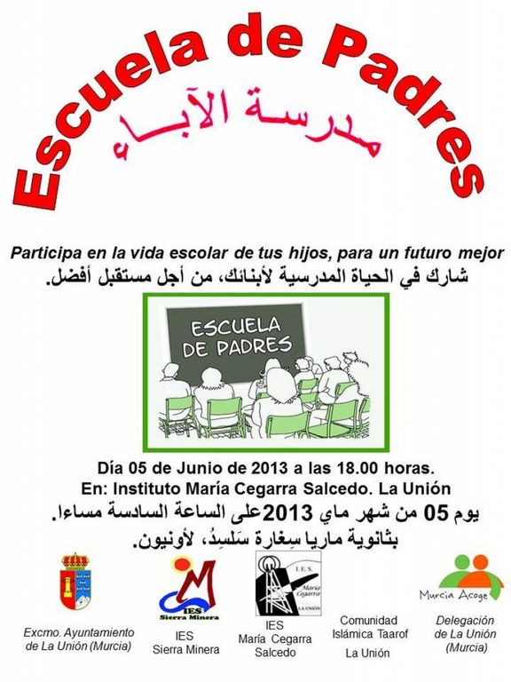 Desde el Centro de Servicios Sociales del Ayuntamiento de La Unión, en colaboración con Murcia Acoge y los Centros Educativos del municipio, se han realizado durante el curso 2012-2013 dos Escuelas de Padres los días 12 de diciembre de 2012 y 14 de marzo de 2013, coincidiendo con los trimestres del periodo lectivo. Han sido partícipes padres y madres inmigrantes, vecinos de nuestro municipio, con una actitud de interés y entusiasmo por la actividad que se estaba realizando. Para finalizar este curso, se ha convocado de nuevo a este colectivo mañana miércoles día 5 de junio a las 18.00 horas en el IES “María Cegarra Salcedo”.