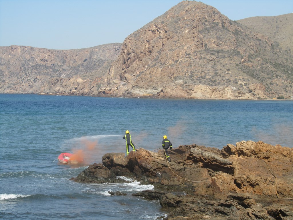 Los efectivos del Plan COPLA, Protección Civil y Cruz Roja de La Unión han realizado esta mañana en la playa de El Lastre, en Portmán, un ejercicio conjunto de salvamento marítimo en el que se ha simulado el rescate de los tripulantes de una embarcación en llamas, el auxilio y reanimación de los mismos y la extinción del incendio.
