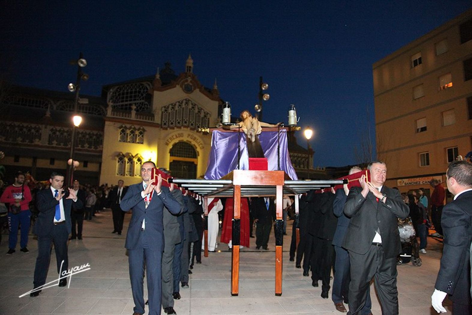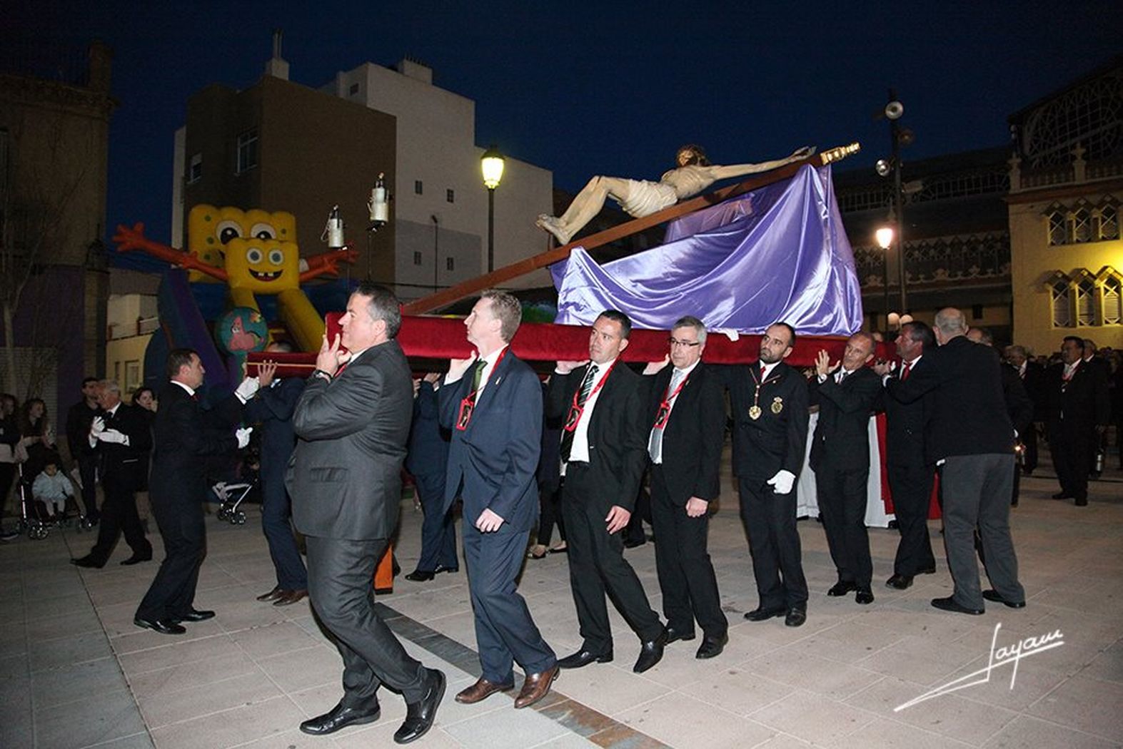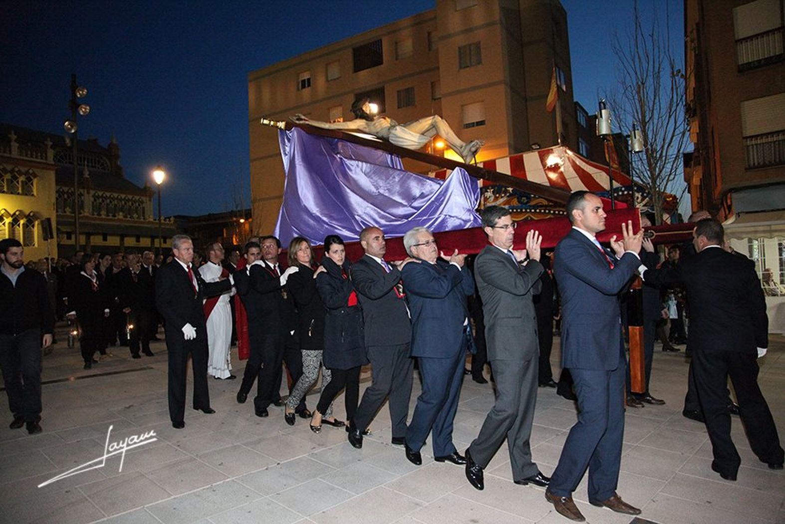 A lo largo del Vía Crucis, el Cristo fue portado a hombros por componentes de su Agrupación, así como de varios colectivos de la localidad, como los Caballeros de Santa Bárbara, las Comunidades Neocatecumenales, los miembros del Equipo de Gobierno y los de la Mesa de la Cofradía.