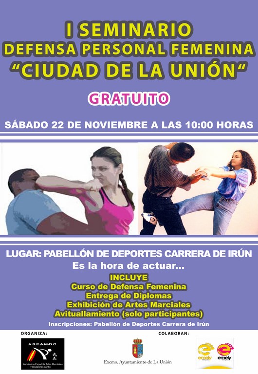 La Asociación Española de Artes Marciales y Disciplinas Cardio Deportivas (ASEAM-DC) ha organizado para este sábado día 22 de noviembre, a partir de las 10:00 horas, en el Pabellón Polideportivo de Carrera de Irún, el primer Seminario de defensa personal femenina “Ciudad de La Unión”, impartido por el Sensei Pedro Miranda, todo ello en colaboración con las Concejalías de Deportes y de Mujer del Ayuntamiento de La Unión, dirigidas por Laura Vicente y Rosa Pagán, respectivamente.