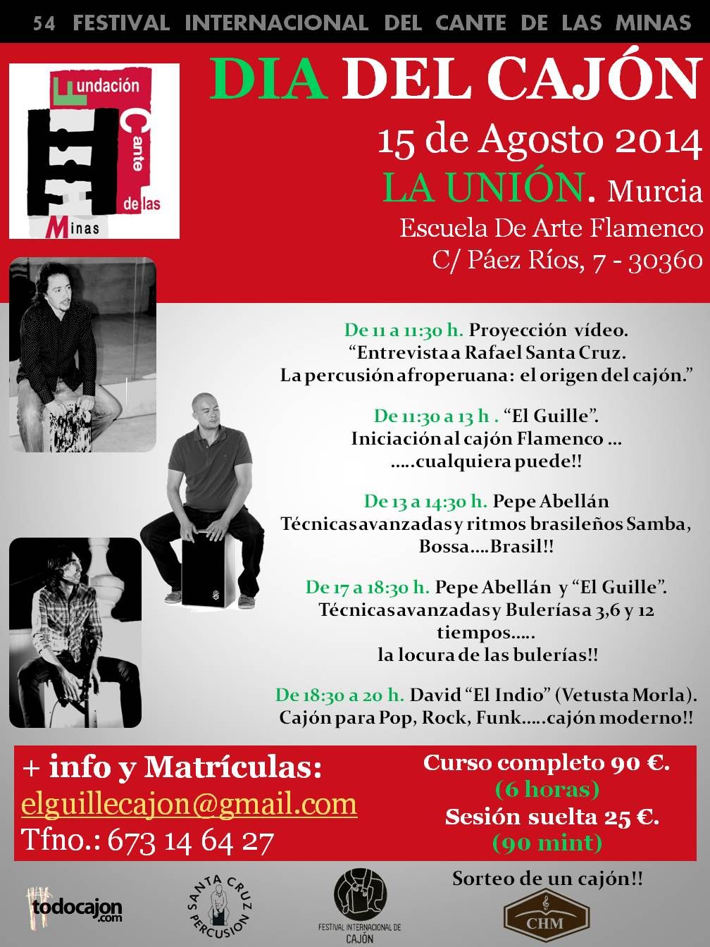 La Unión, 13 agosto 2014.- Este viernes, día 15 de agosto, arranca el homenaje organizado por el Festival Internacional del Cante de las Minas al inolvidable maestro Paco de Lucía, un homenaje que se hará extensivo al percusionista, experto en este instrumento, Rafael Santa Cruz, fallecido también repentinamente este mes de agosto. Los actos previstos se iniciarán con el “Curso de Iniciación y Técnicas Avanzadas del Cajón”, a cargo de los percusionistas “El Guille”, Pepe Abellán y David “El Indio”.