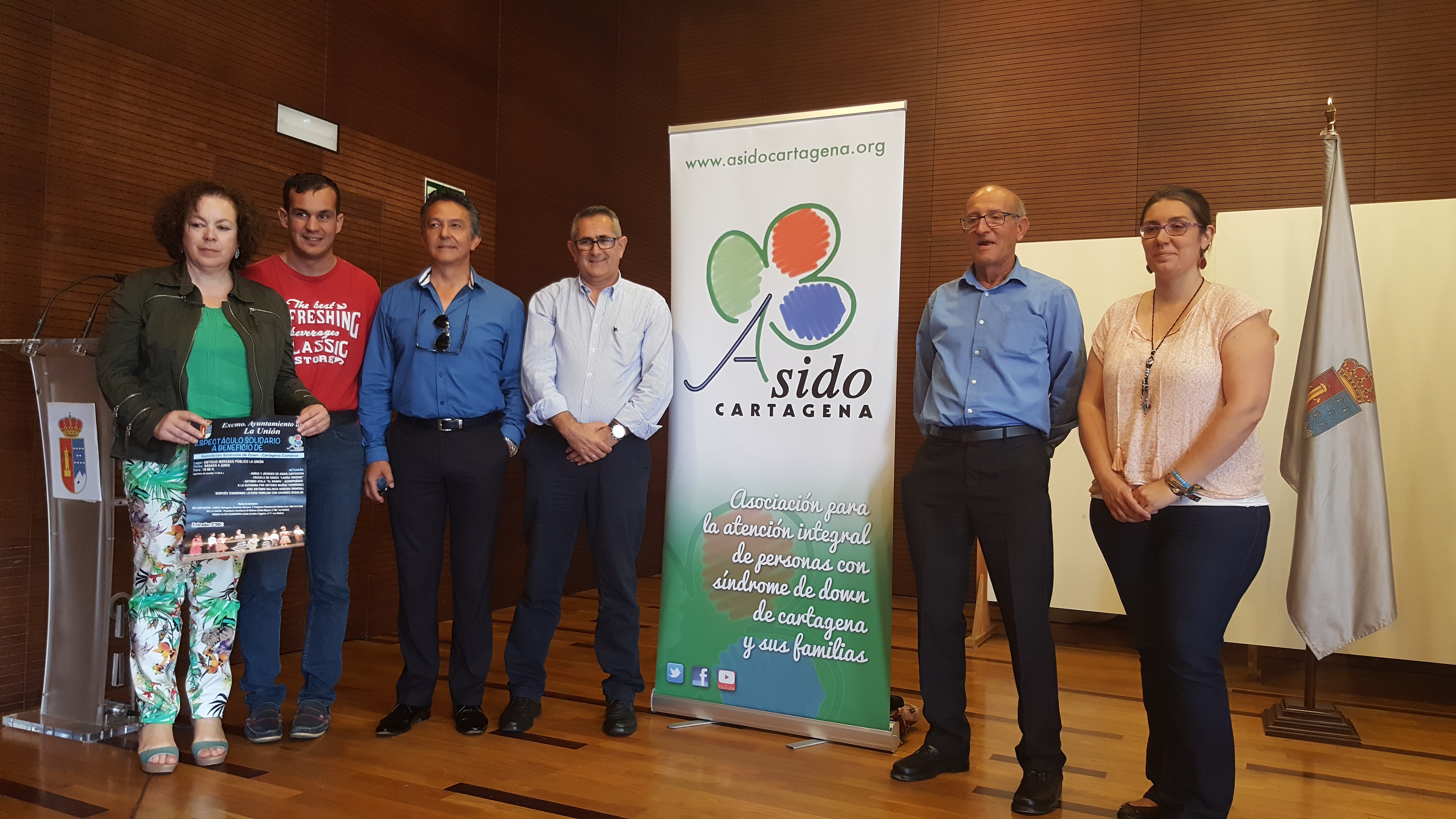 El Alcalde de La Unión, Pedro López Milán, la Concejal de Cultura, Carmen Riquelme y el Presidente de Asido en la Comarca de Cartagena, Juan Carrasco, han presentado en el Salón de Plenos el espectáculo solidario a beneficio de la Asociación Síndrome de Down en el que participarán niños y jóvenes de la Asociación.