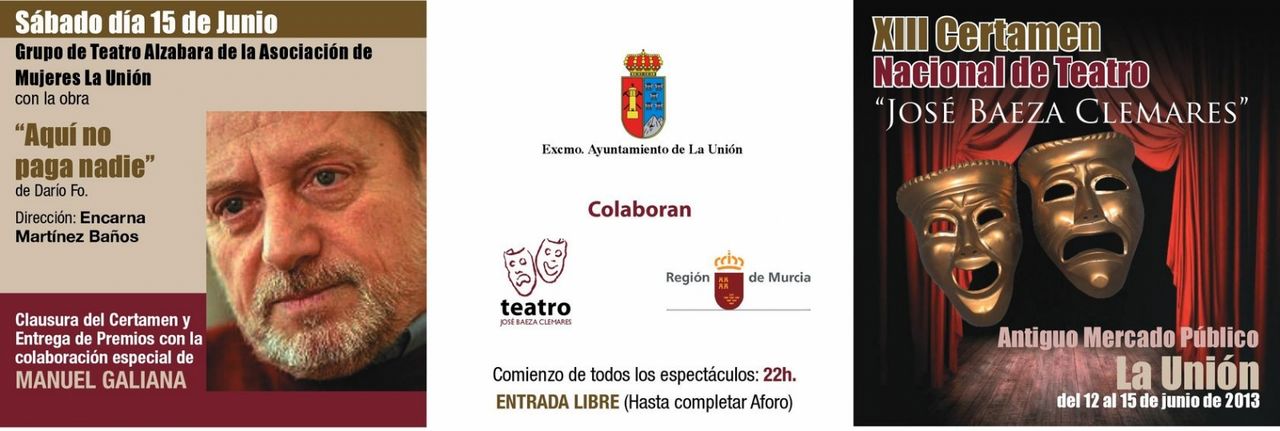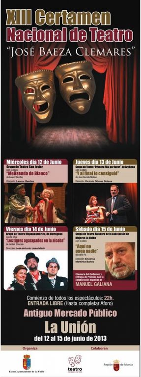 Esta noche, a las 22.00 horas, da comienzo en el Antiguo Mercado Público de La Unión, el Certamen Nacional de Teatro “José Baeza Clemares”, la entrada al recinto es libre y gratuita para todos los ciudadanos, hasta completar el aforo.