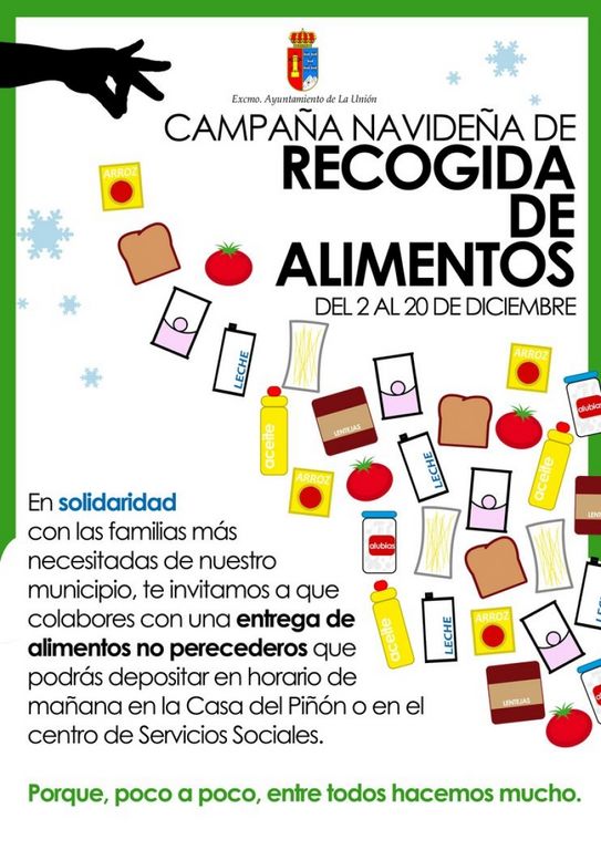 La Concejalía de Política Social del Ayuntamiento de La Unión, que dirige Rosa Pagán, ha puesto en marcha un año más su tradicional Campaña Solidaria para la Recogida de Alimentos No Perecederos de cara a la próxima Navidad.