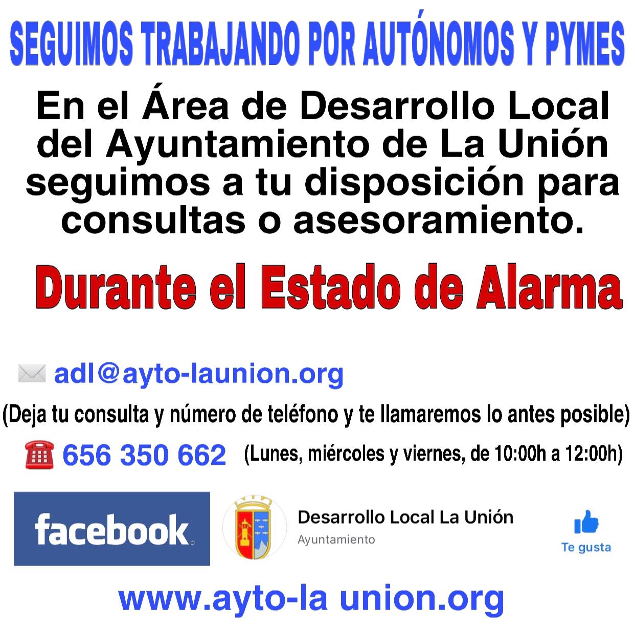 La Agencia de Desarollo Local del Ayuntamiento de La Unión,sigue trabajando para asesorar y ayudar a los autónomos y PYMES del Municipio, para ello ha habilitado una dirección de correo y un teléfono en los que podrán realizar las consultas o dudas que se tengan sobre las ayudas que el Gobierno ha establecido durante el Estado de Alarma en relación a estos colectivos.