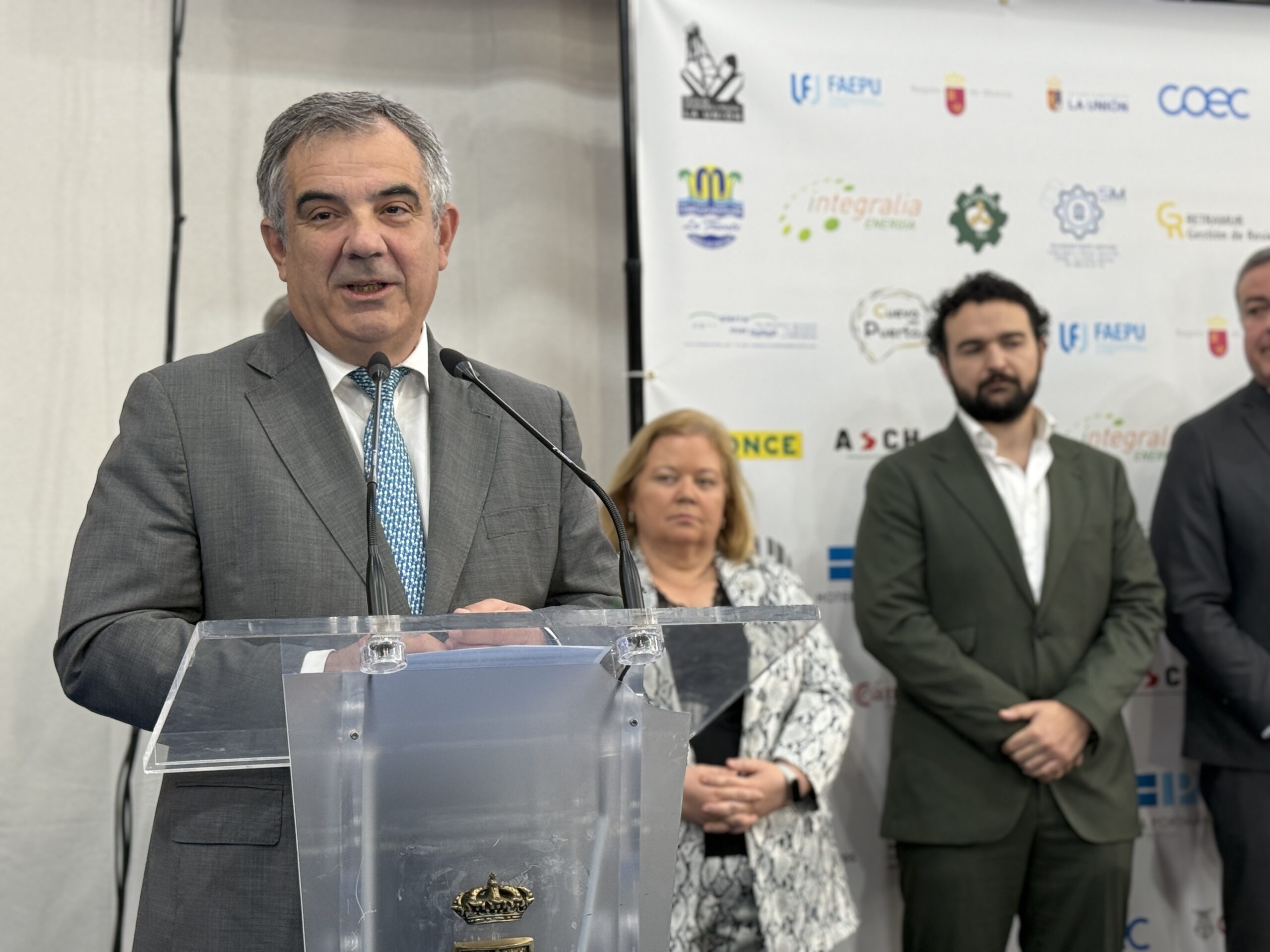 El acto de apertura ha contado con la presencia del consejero de Medio Ambiente, Universidades, Investigación y Mar Menor, Juan María Vázquez; el presidente de FAEPU y también presidente de la Feria, Carlos Bernabé; el alcalde de La Unión, Joaquín Zapata; el senador de la Rein de España; el director general de Minas; así como otras personalidades empresariales y locales, miembros de la Corporación Municipal y representantes del ámbito científico y cultural.