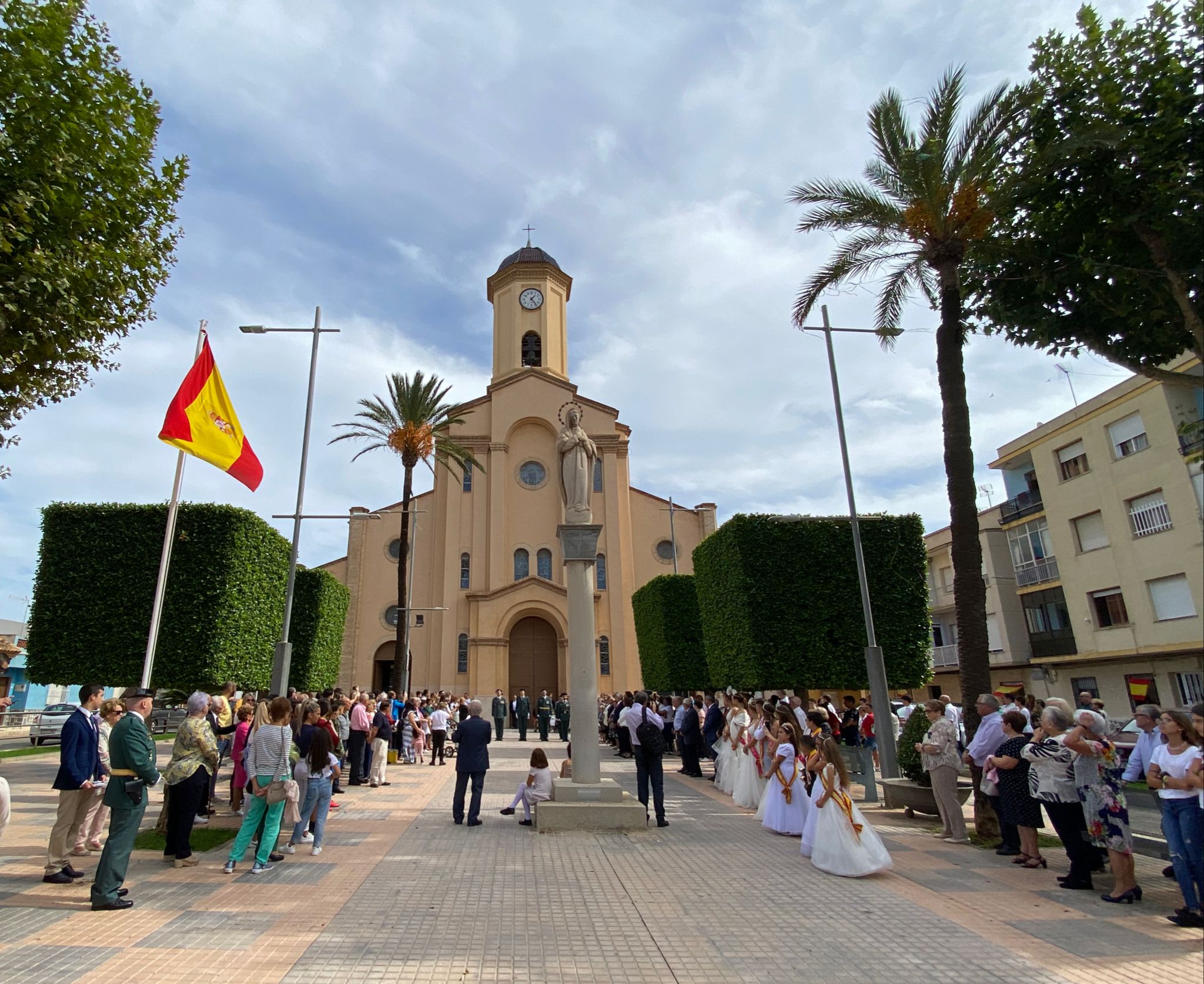 La iglesia del Rosario ha acogido minutos antes la Santa Misa en honor de la Virgen del Pilar, patrona de la Guardia Civil. Los hijos de los agentes del Puesto de La Unión han leído las peticiones y han ofrecido flores ante la imagen en el altar mayor.