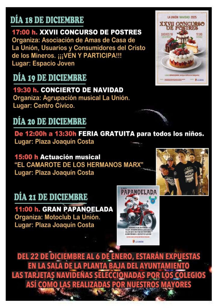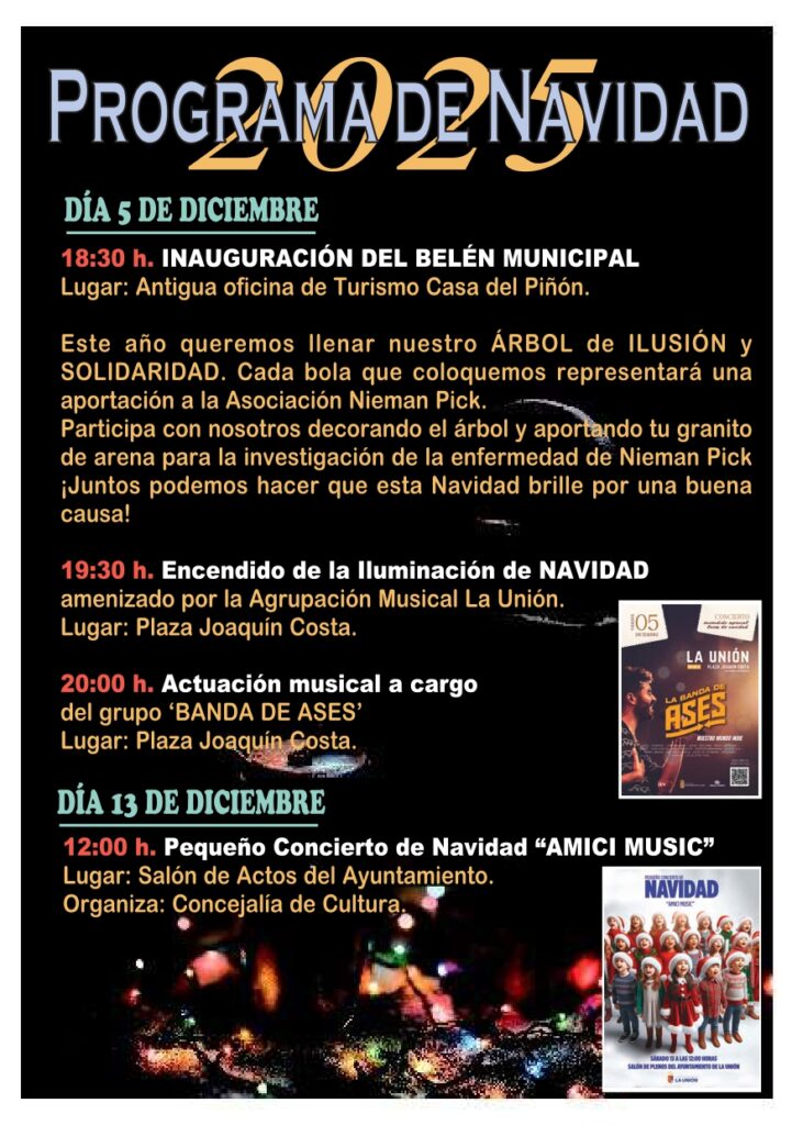 El Ayuntamiento de La Unión presenta su Programa de Navidad 2025, lleno de actividades para disfrutar en familia, apoyar a nuestro comercio local y vivir juntos la magia de estas fechas tan especiales.