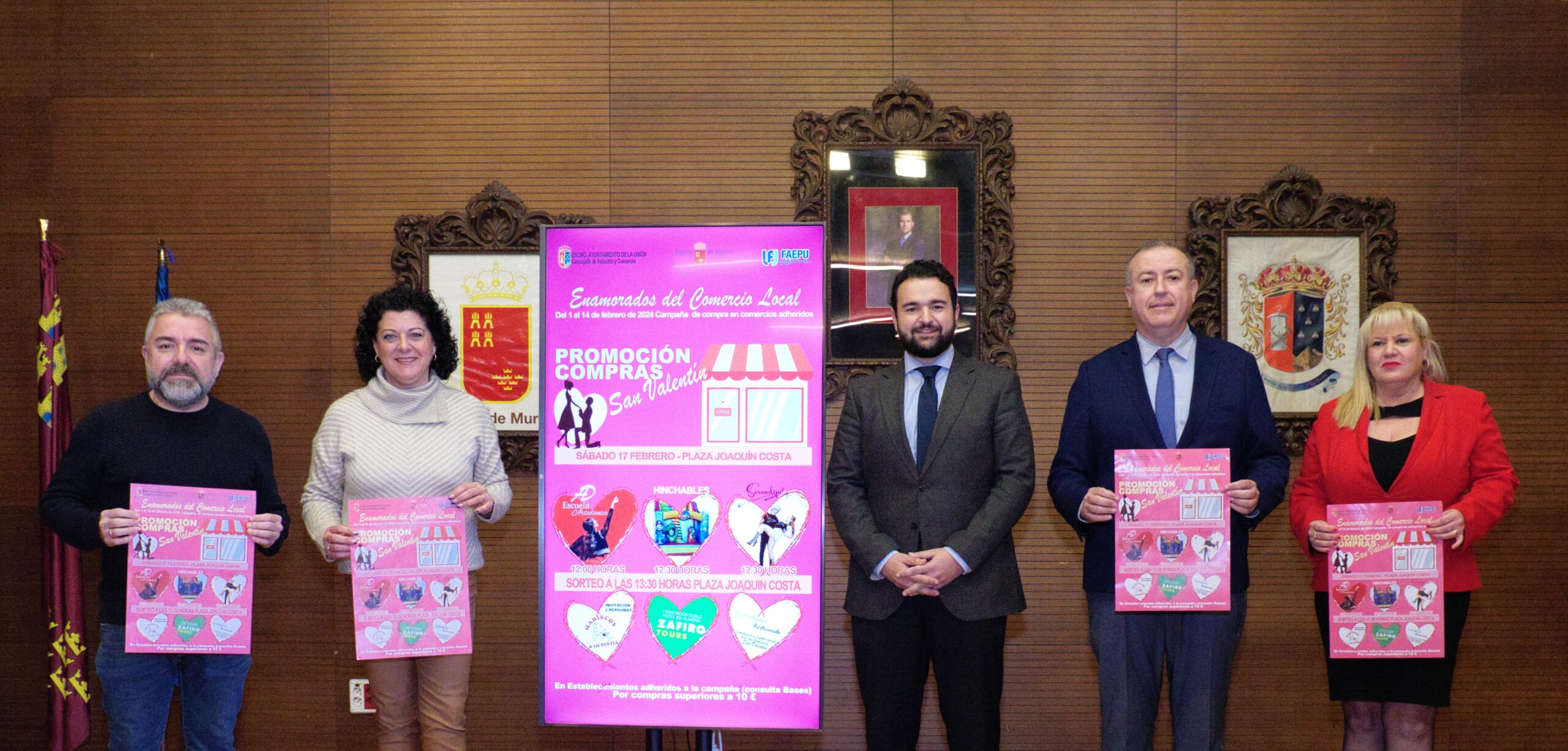 El alcalde presentó hoy, junto con el presidente de la Federación de Asociaciones de Empresarios y Profesionales de La Unión, FAEPU, Carlos Bernabé, la campaña ‘Enamorados del Comercio Local’ que se celebrará del 1 al 14 de febrero para promocionar el apoyo y la dinamización del comercio del municipio. La campaña está organizada por el Ayuntamiento y el Gobierno regional, en colaboración con FAEPU y en ella participan alrededor de 32 comercios del municipio.