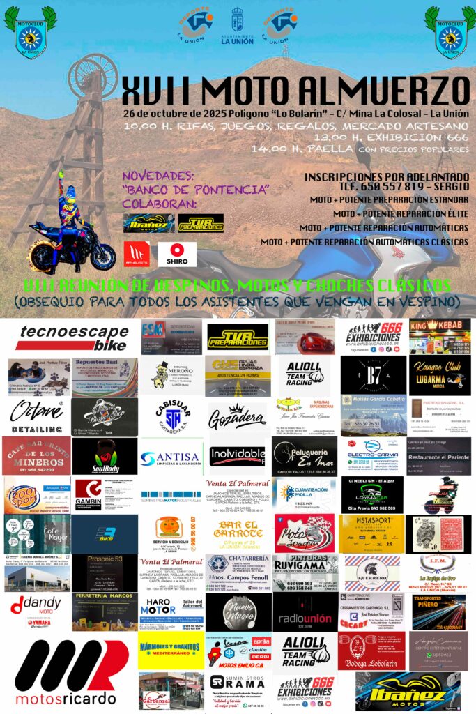 La Unión volverá a rugir con el motor el próximo domingo 26 de octubre de 2025, con la celebración del XVII Moto Almuerzo, organizado por el Moto Club La Unión, en colaboración con el Ayuntamiento de La Unión.