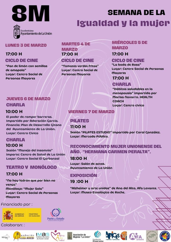 Desde el Ayuntamiento de La Unión se invita a toda la ciudadanía a participar en esta semana dedicada a la igualdad y el reconocimiento del papel fundamental de la mujer en la sociedad.