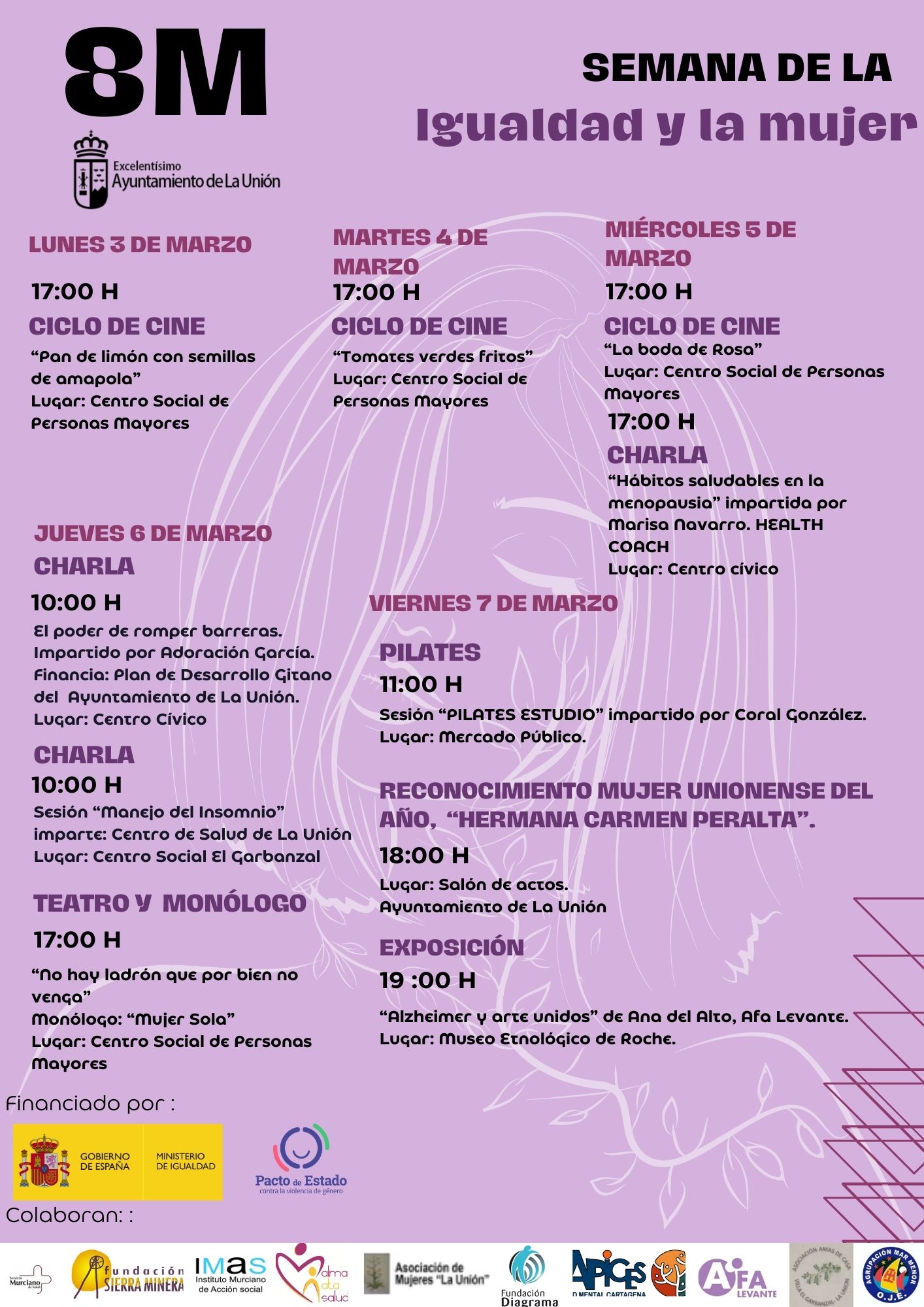 Entre las actividades destacadas se encuentra el ciclo de cine, con la proyección de películas emblemáticas sobre la igualdad, así como charlas y talleres sobre salud, bienestar y empoderamiento femenino. Además, el programa incluye un monólogo y una obra de teatro, una sesión de pilates, y el tradicional reconocimiento a la Mujer Unionense del Año, que en esta edición recae en la Hermana Carmen Peralta.