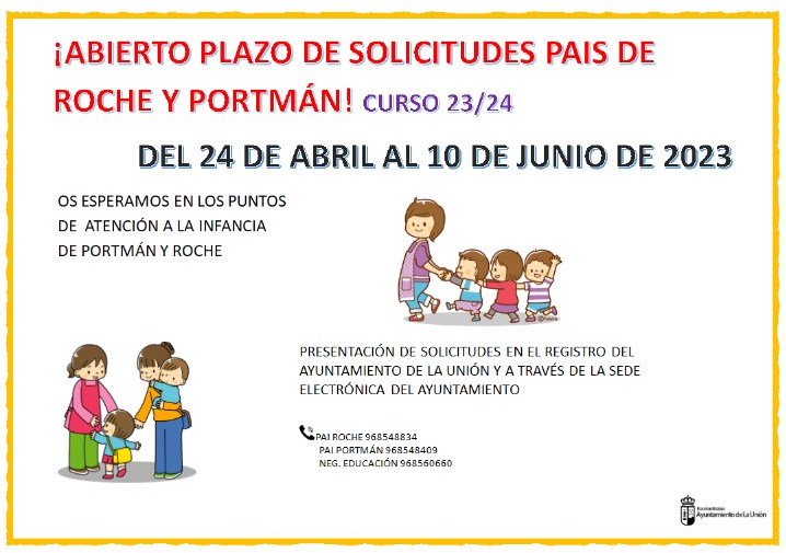 Los Puntos de Atención a la Infancia de Portmán y Roche han abierto hoy el plazo de solicitudes para el curso 2023/2024 . El último día para presentar las instancias será el 10 de junio según las bases aprobadas y en este enlace se pueden consultar todos los documentos a aportar por los padres con niños y niñas de 0 a 2 años: