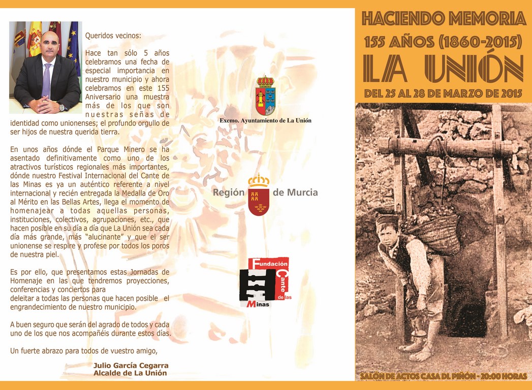 Mañana miércoles, a las 20.00 horas, en el Salón de Actos de nuestro Ayuntamiento, comienza el programa de actos conmemorativos del 155 cumpleaños de nuestro municipio, que quedó oficialmente constituido, de forma independiente a Cartagena, en el día 1 de enero de 1860 con el nombre de “Villa de El Garbanzal”.