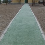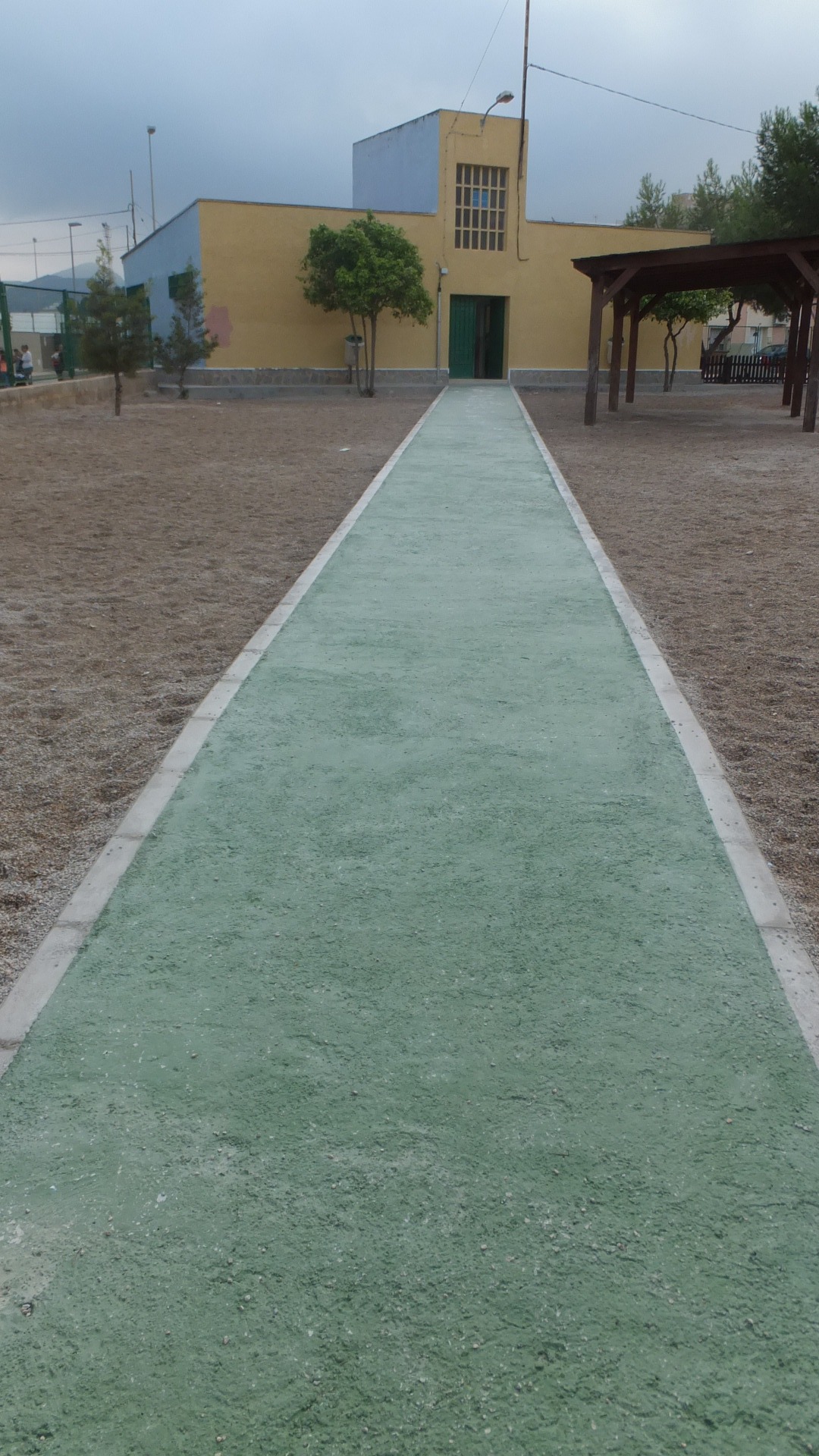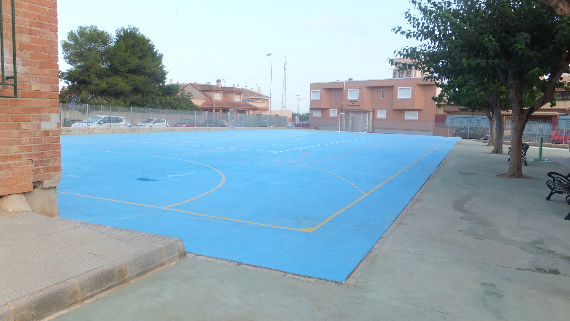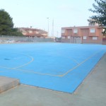 Igualmente, en el exterior del recinto también se ha actuado,  nivelando la zona existente del depósito de gasoil; además se ha intervenido sobre la pista deportiva, tapando grietas y con limpieza y pintado de la misma con señalización de juegos. Se ha actuado en el tramo de paso con hormigón fratasado para acceso desde el patio a la zona de aula y vestuarios del Pabellón de planta baja colindante con la calle Isabel la Católica.