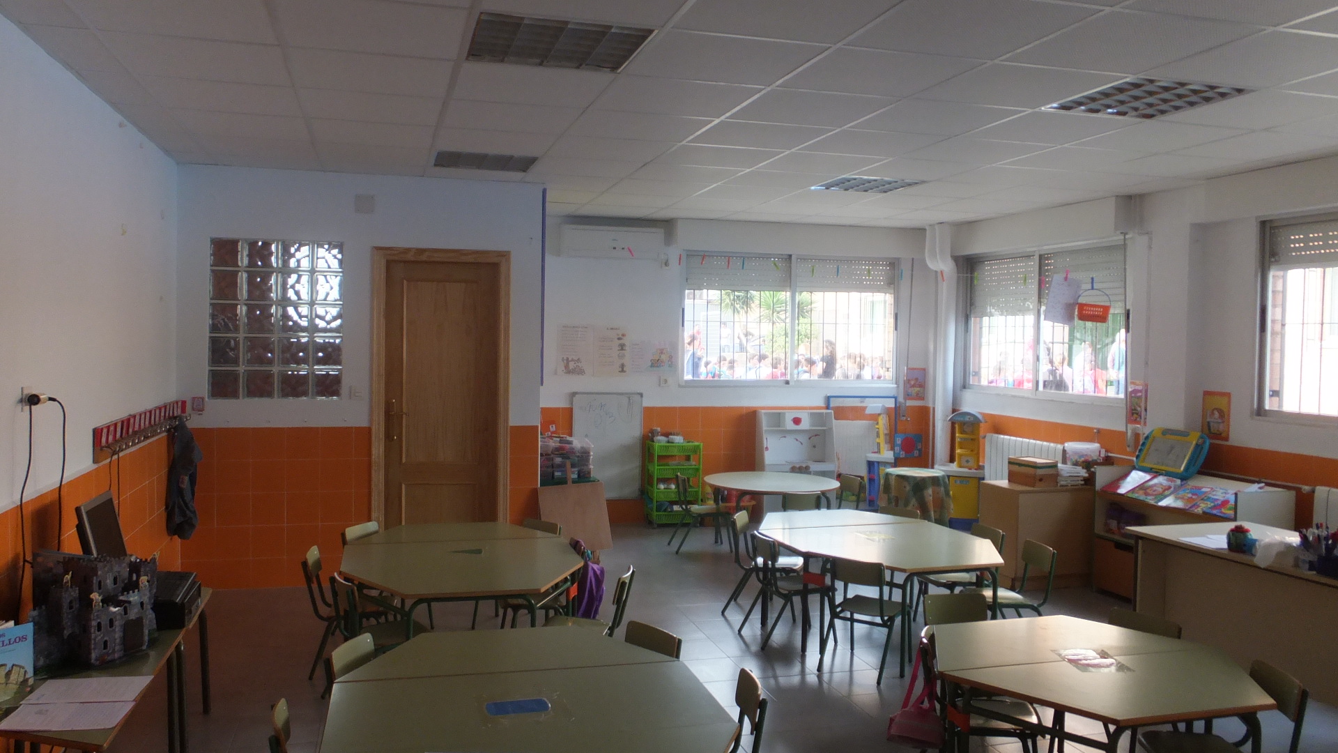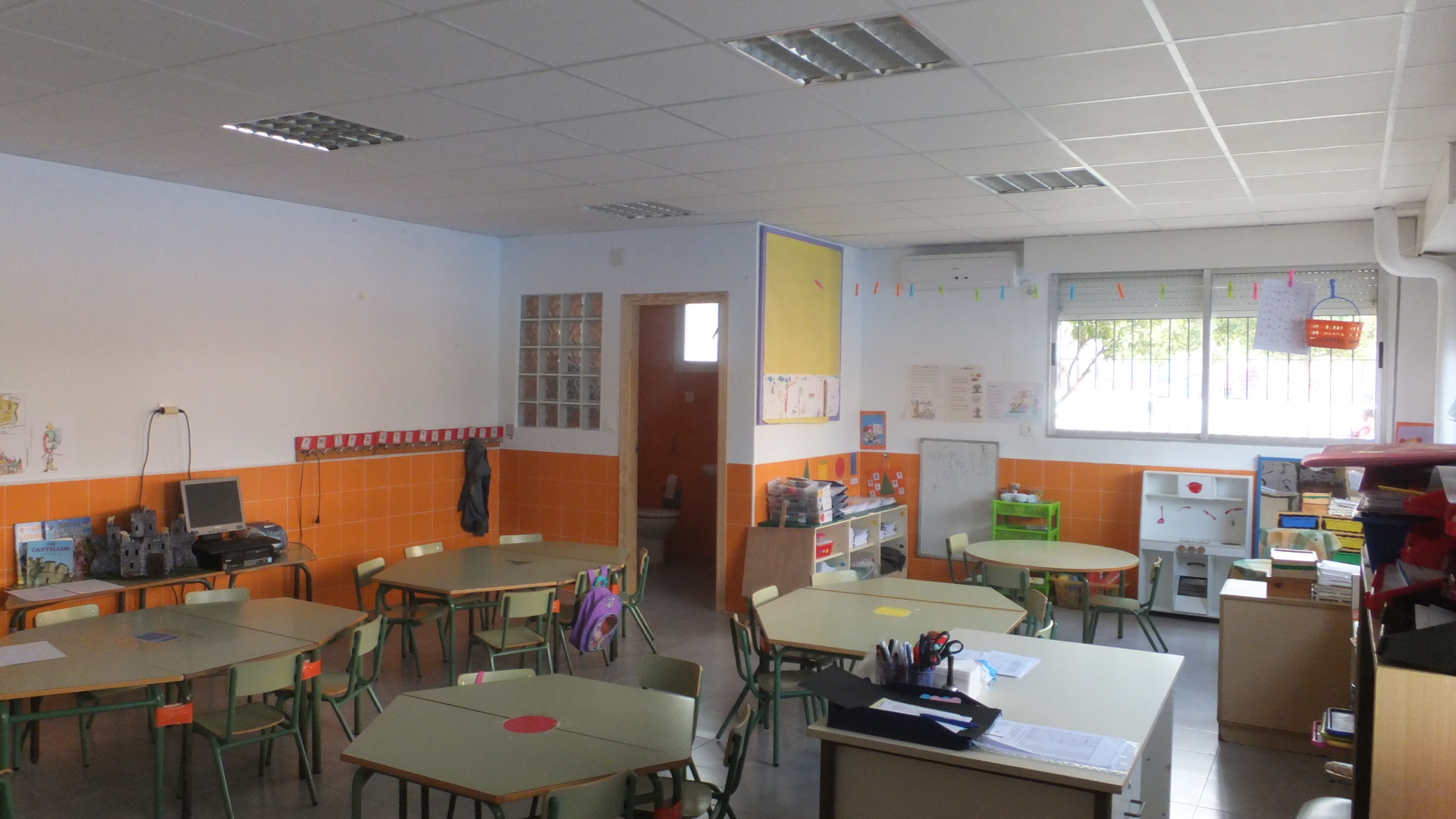 • Formación de un Aula Infantil en la zona del Salón de Actos en la planta baja, con un aseo interior, techo desmontable, instalación eléctrica, radiadores para calefacción, Split para aire acondicionado, sustitución de solado y colocación de zócalo tipo gres en color.