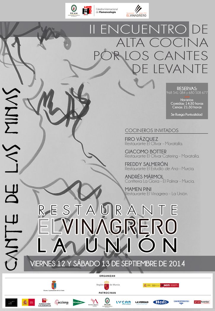 El Restaurante El Vinagrero, de La Unión, ha organizado para esta semana el II Encuentro de Alta Cocina por los Cantes de Levante, una reunión gastronómica y flamenca del más alto nivel, que cuenta con la colaboración de la Fundación Cante de las Minas y de la Universidad Católica de Murcia, a través de la Cátedra Internacional de Flamencología que gestionan ambas instituciones.