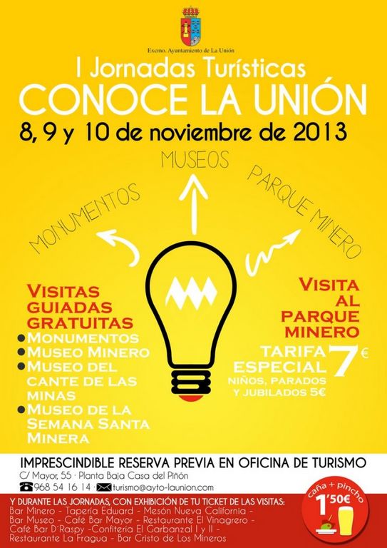 La Concejalía de Turismo que dirige Laura Vicente ha puesto en marcha, de cara al fin de semana del 8, 9 y 10 de noviembre próximos, las I Jornadas de Turismo “Conoce La Unión”, destinadas a dar a conocer, de forma gratuita y a todo aquel que esté interesado, las bondades y atractivos de nuestro municipio.