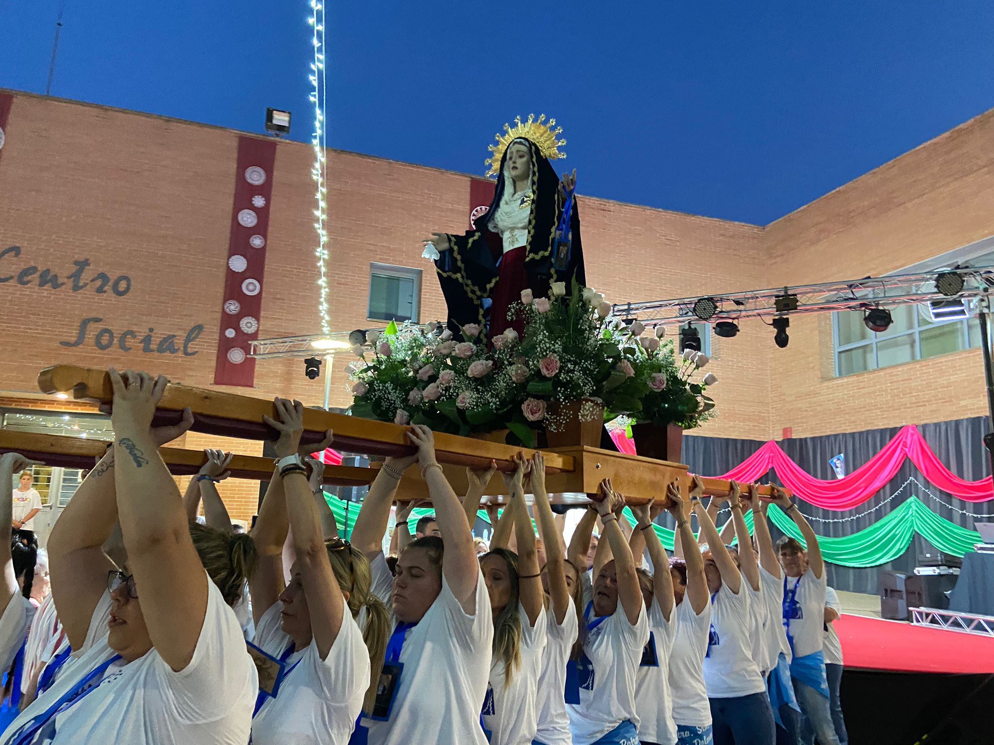Al atardecer partía desde la ermita la imagen de la patrona, Nuestra Señora de los Dolores, portada por las damas de la Agrupación y escoltada por los tambores de la Asociación Juvenil Quillo. En la plaza del Centro Social, el párroco Luis Miguel García oficiaba la eucaristía con la ofrenda de flores por parte de las reinas y rey de las fiestas y del alcalde, Pedro López Milán, el pedáneo, Ginés Luengo, y el concejal de Festejos, David García.