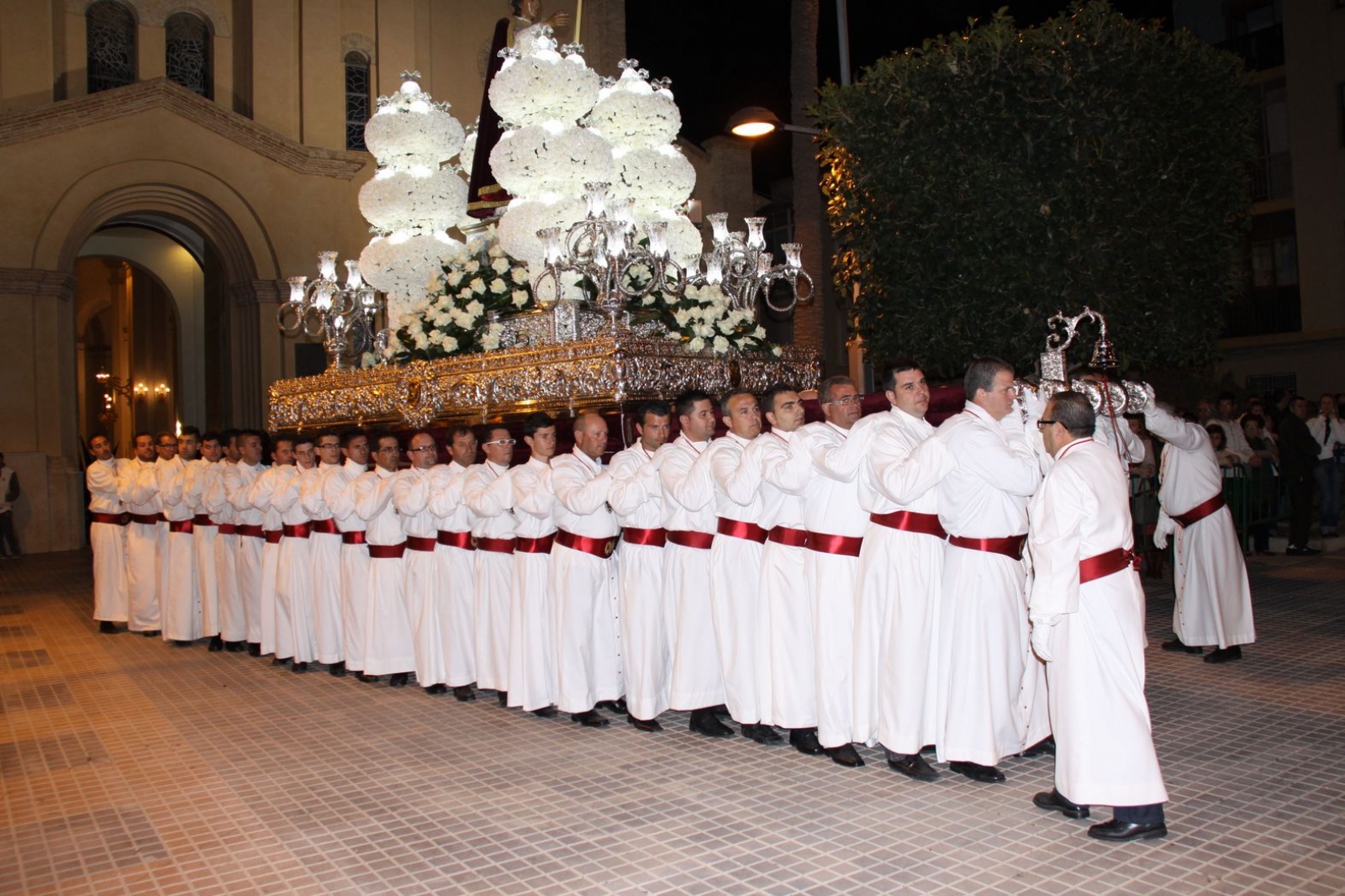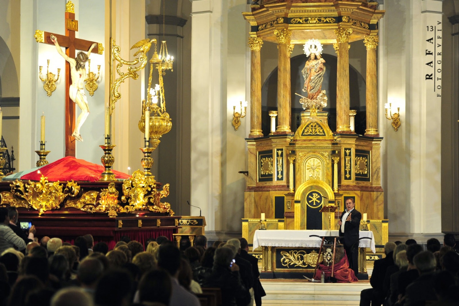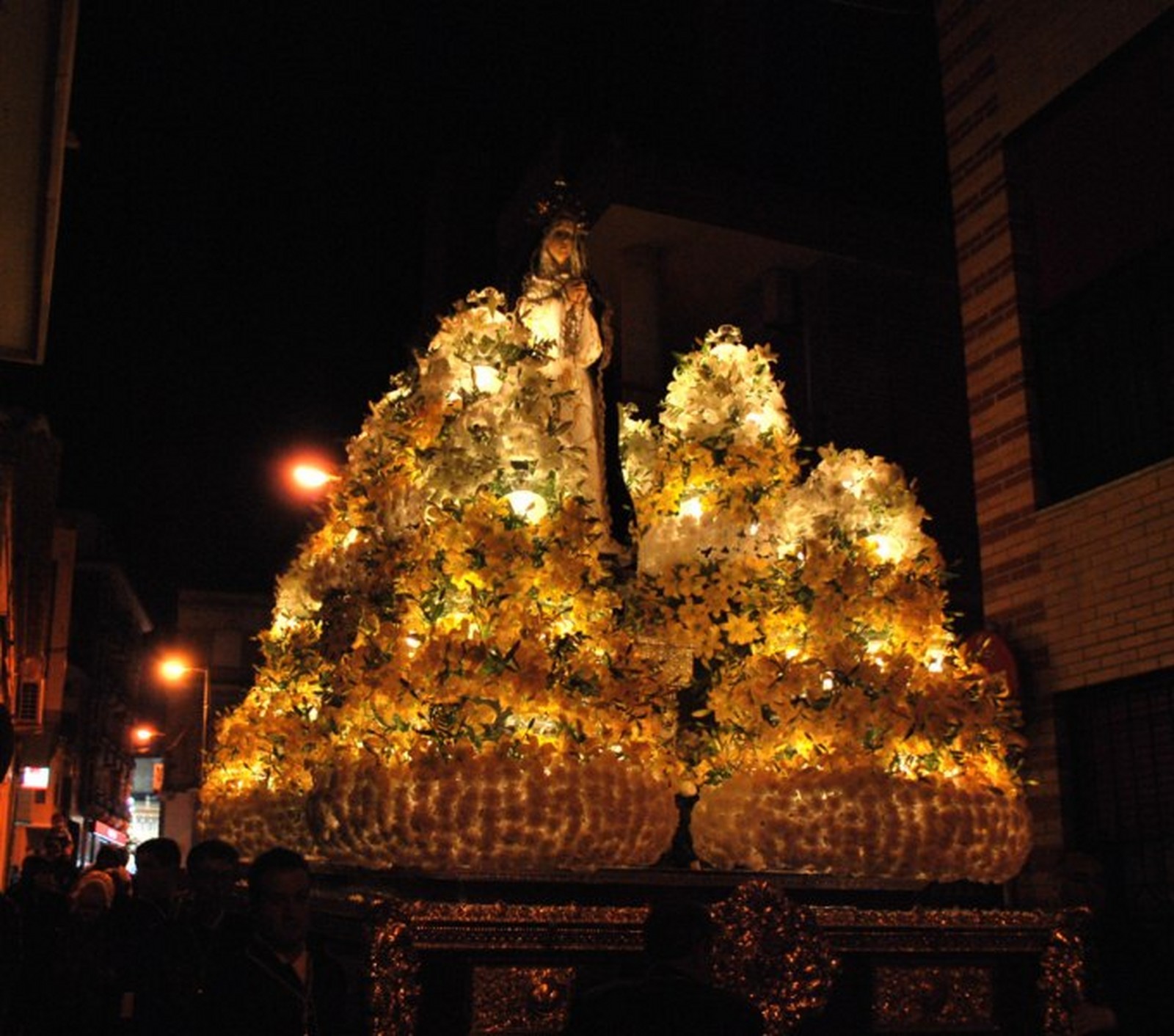 Los tronos se engalanan y desfilan entre oraciones y los ecos desgarradores de los cantaores participantes en el Concurso Nacional de Saetas que año tras año se celebra en ésta Procesión.